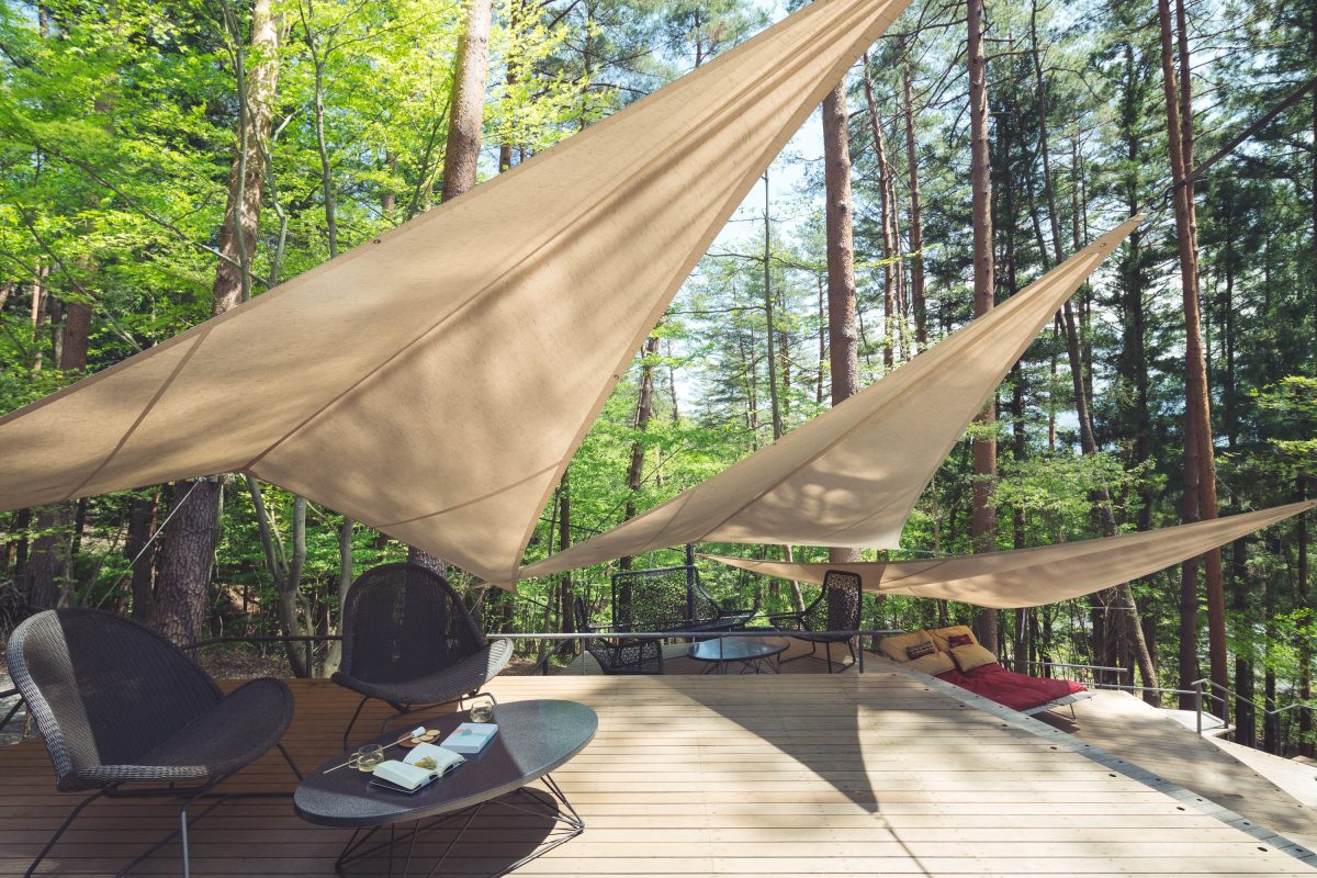 從接待區(Reception)上到丘陵,首先出現的客房被設置在最能清楚眺望河口湖的草原區,其間點綴著四季變化的櫻花和紅葉。再往上走,便會看見露台漂浮在松林之中。雲端露台正是這樣一個名副其實地「漂浮在森林中」,能與巨大的樹木融為一體的空間。這裡設計了可以在遮陽篷下放鬆、一邊沉浸在自然中一邊沖煮咖啡、或者圍著營火休憩的機制,讓森林本身成為一個休憩的場所,引領客人深入豪華露營的體驗。