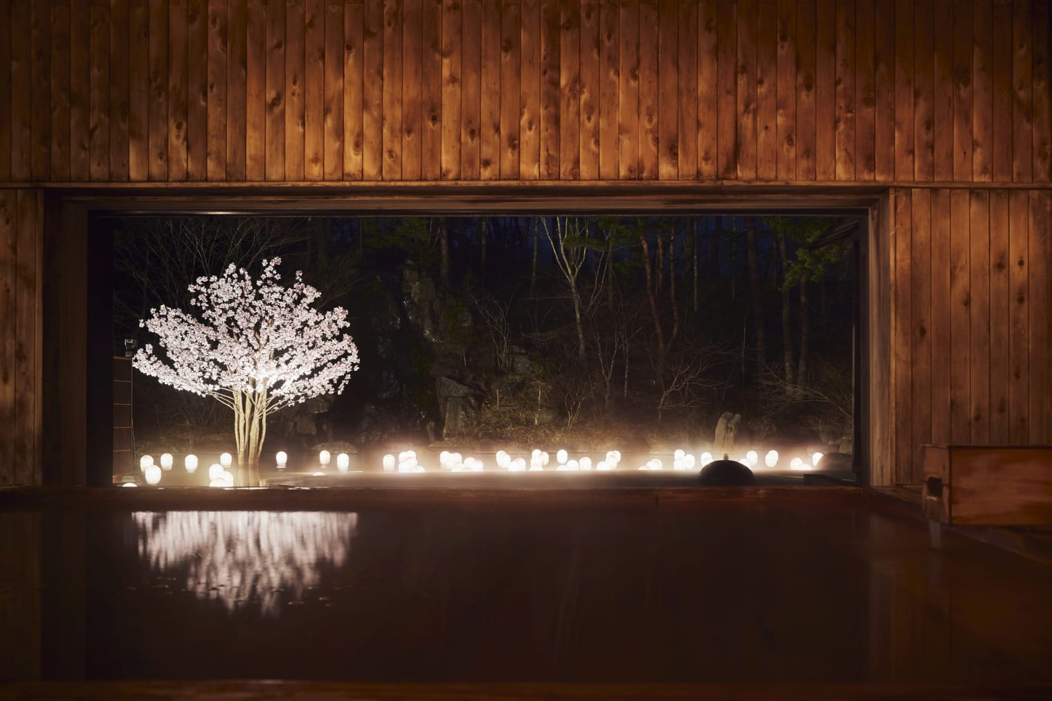 While the water surface sparkles with the lights of the Tsugaru Biidoro, a traditional craft, you can enjoy the luscious hanami open-air bath where the cherry trees made using the Nebuta technique are lit up.