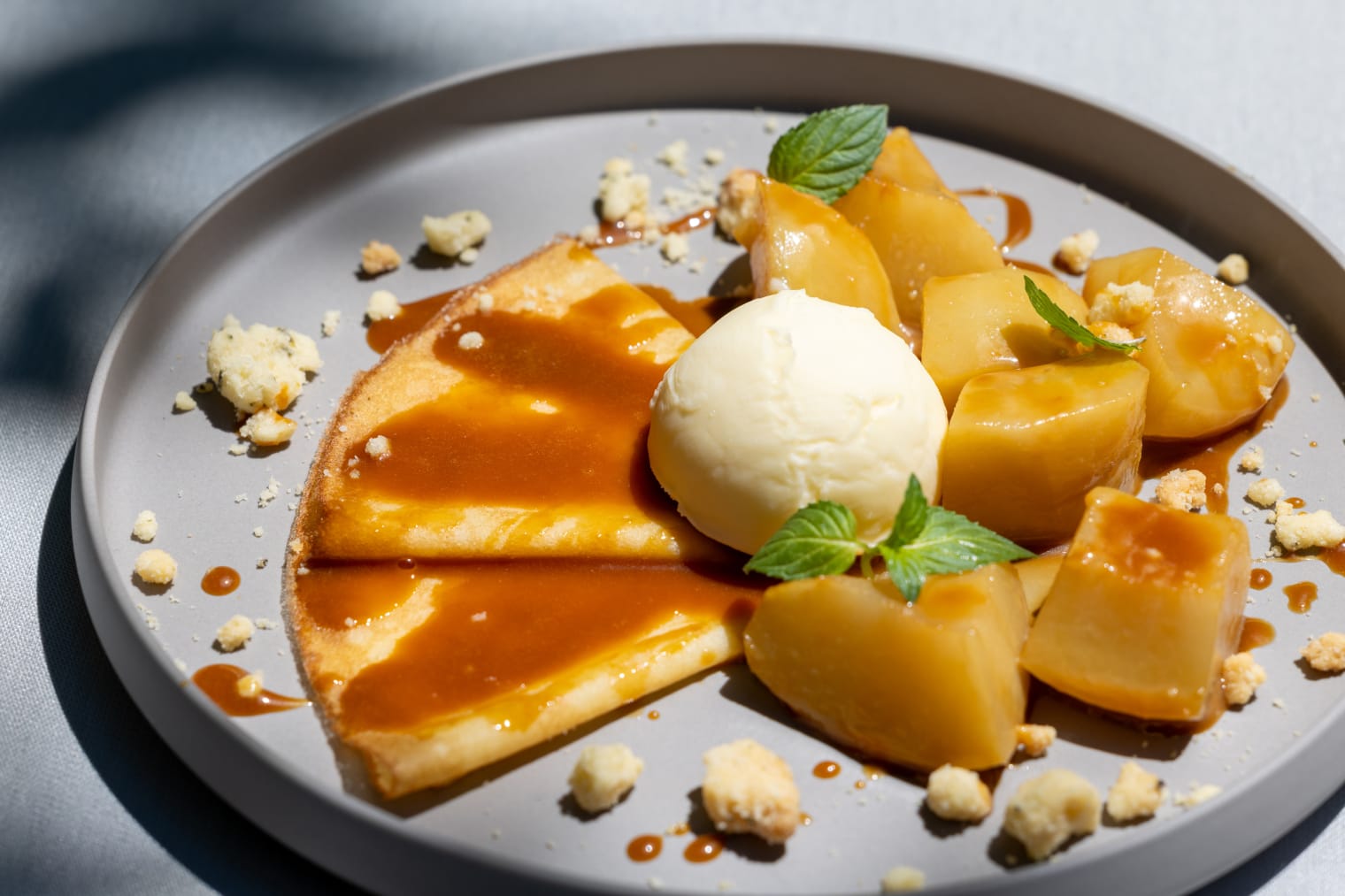 Crêpe Suzette finished over a bonfire using peach wood. This special dessert features the sweet, fragrant aroma of apricot kernels unique to peach wood, enjoyed while watching the crackling flames.