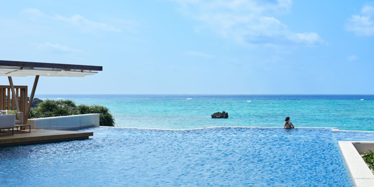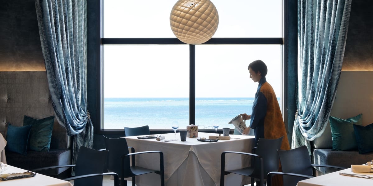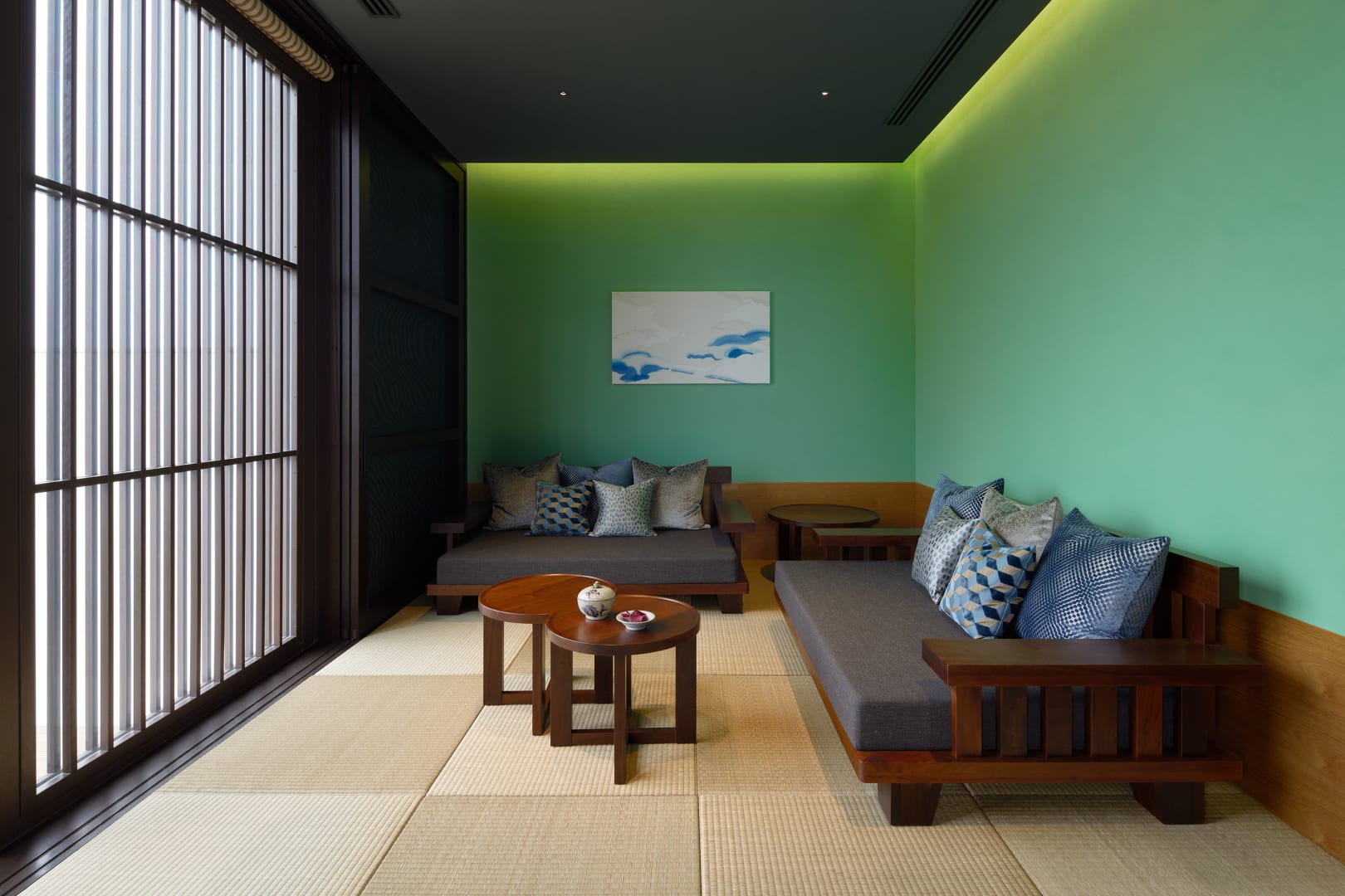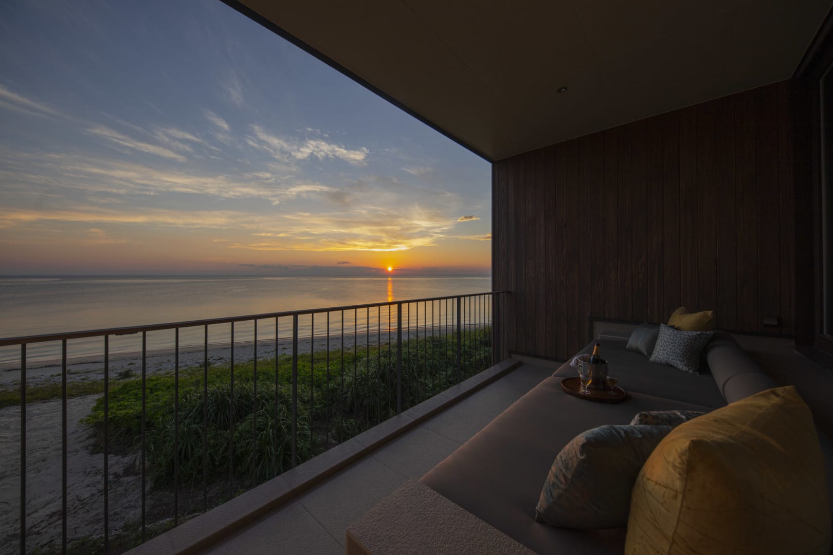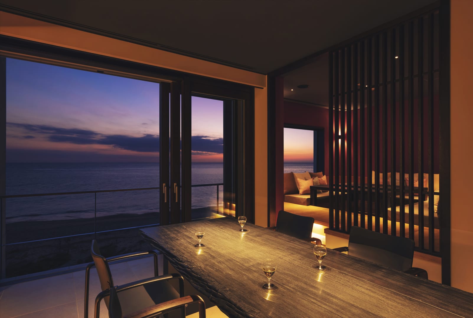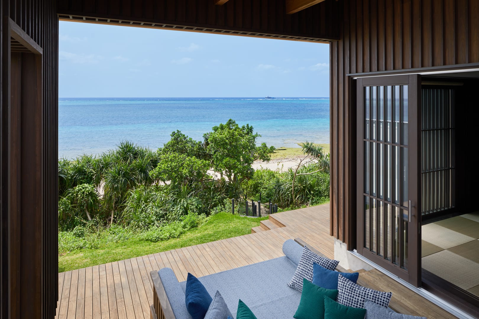A relaxed ambience pervades this suite, with an indoor patio that looks out to the ocean and a living room with low furniture.