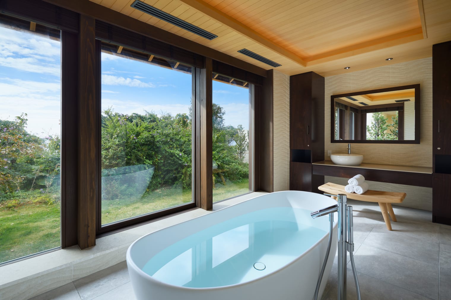 Treatments are conducted in a separate building with a red tiled roof. The treatment room with an open bathroom is available for two people. The after room and treatment room surround the courtyard, creating a sense of greenery.