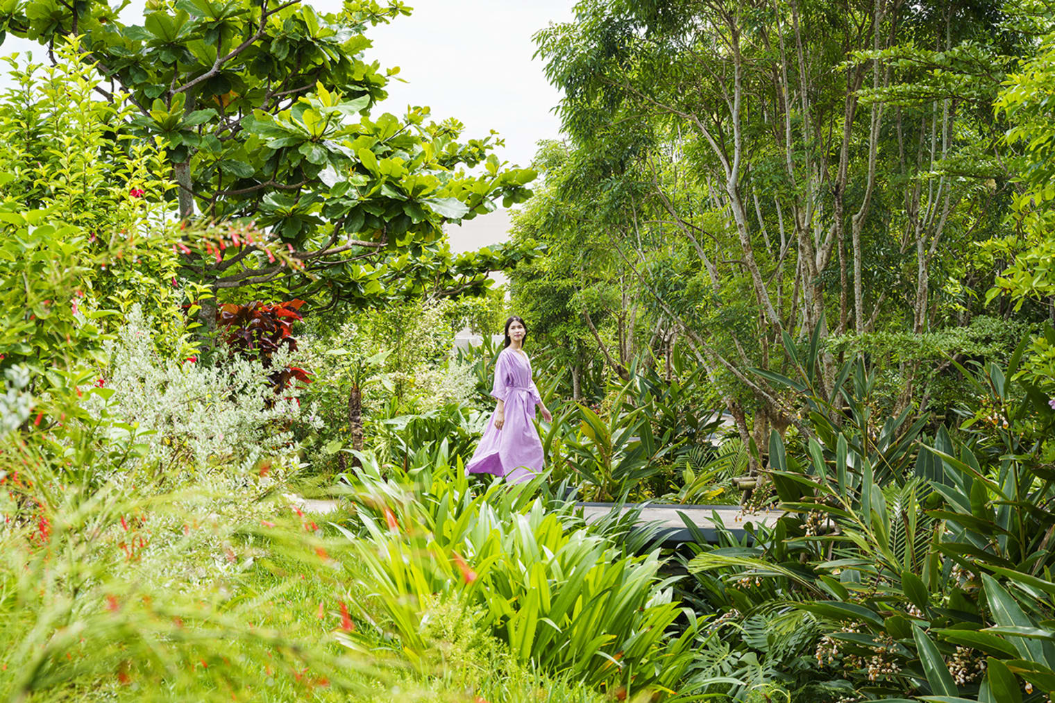 Bingata represents color and pattern. On the Bingata Garden Tour at HOSHINOYA Okinawa, visitors explore dye plants in the garden, then experience Okinawan culture and craftsmanship at the Gathering Hall, adorned with bingata designs.