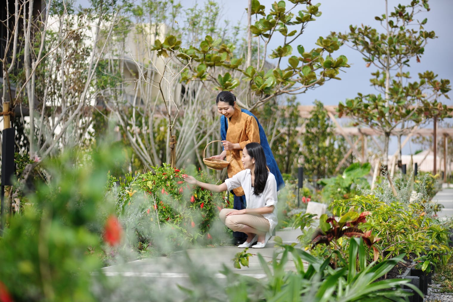 Explore HOSHINOYA Okinawa's garden, discover subtropical plants, Bashofu, and enjoy the breeze.