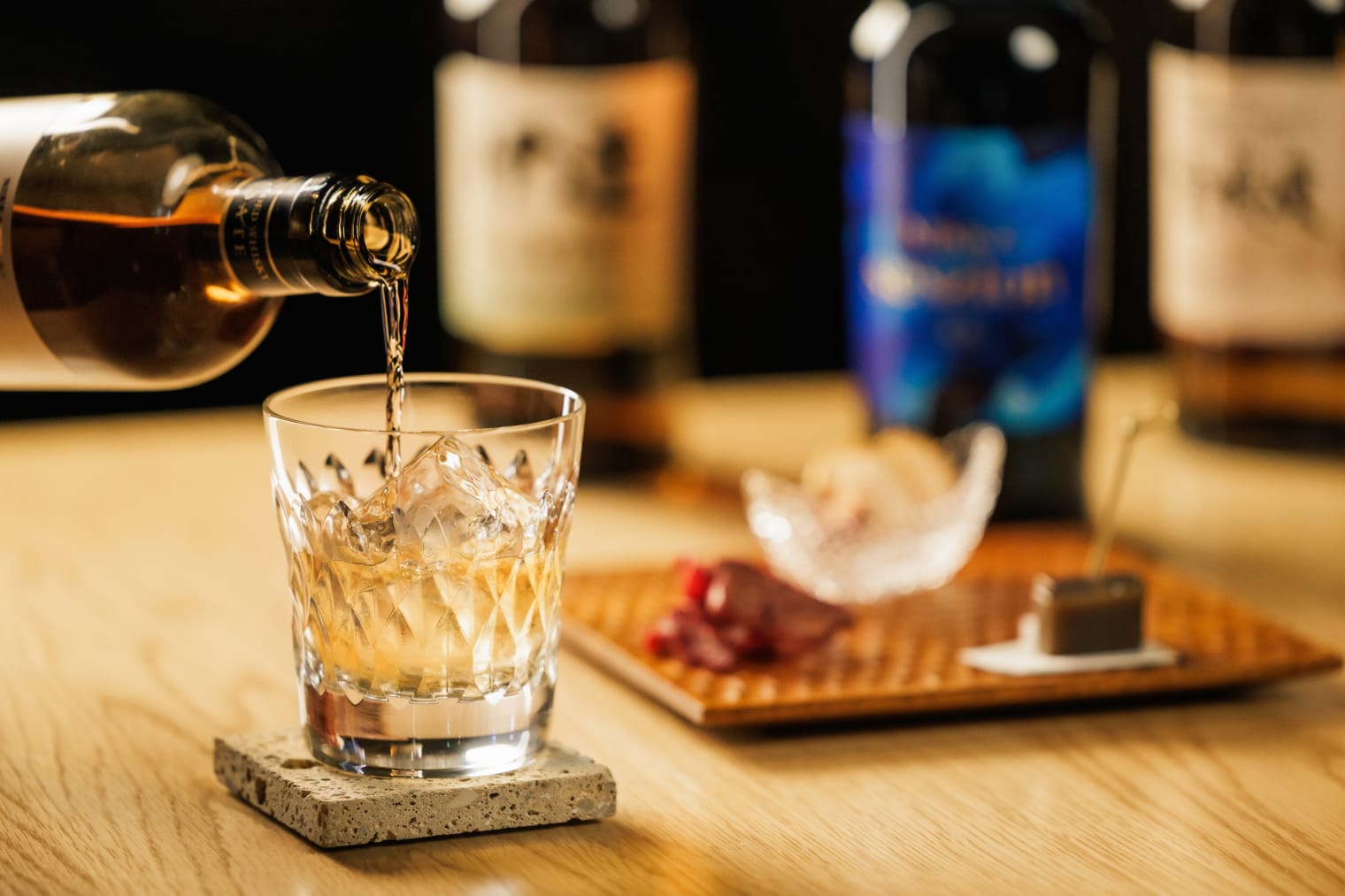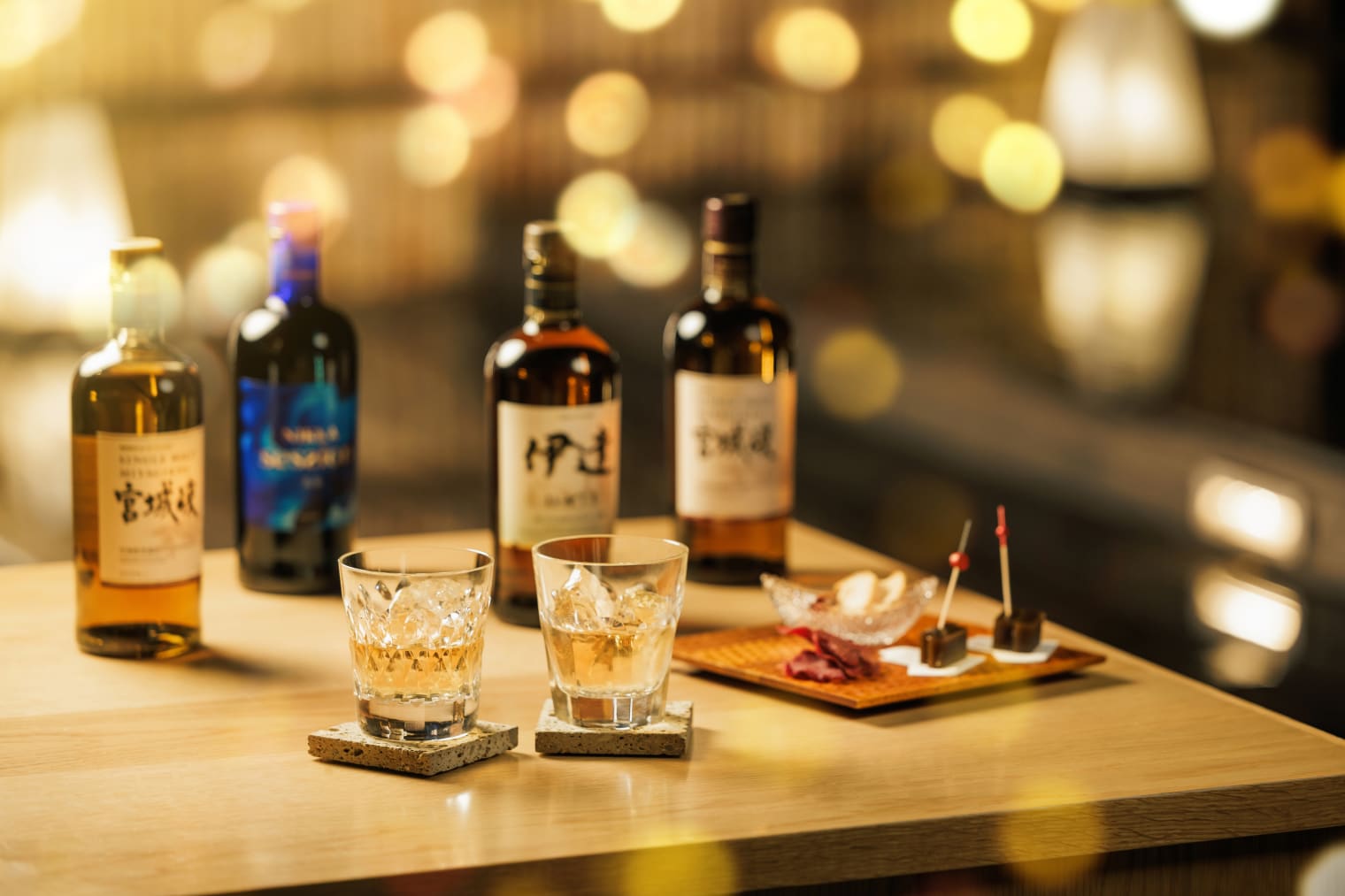 At the lounge, we offer a curated set featuring locally distilled whisky paired with dried fruits and beef tongue jerky. Please enjoy a relaxing moment of refinement after your dinner.