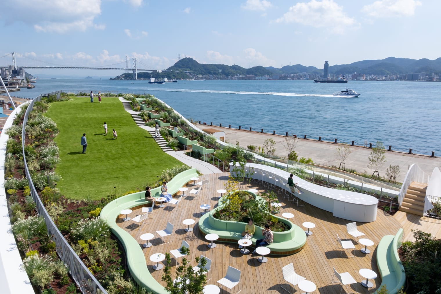 The terrace features a lawn area, benches perfect for lounging, and counter seating, allowing you to spend your time as you please while gazing at the ever-changing scenery of the Kanmon Strait.