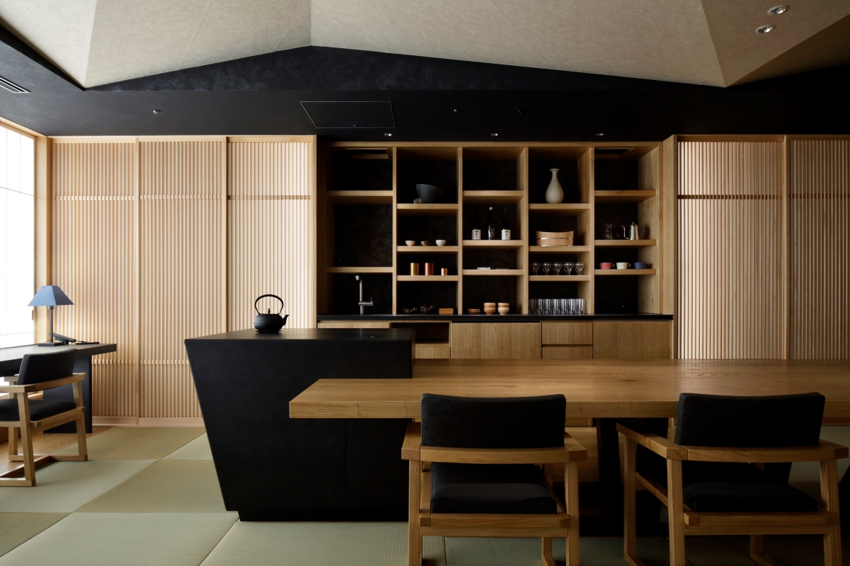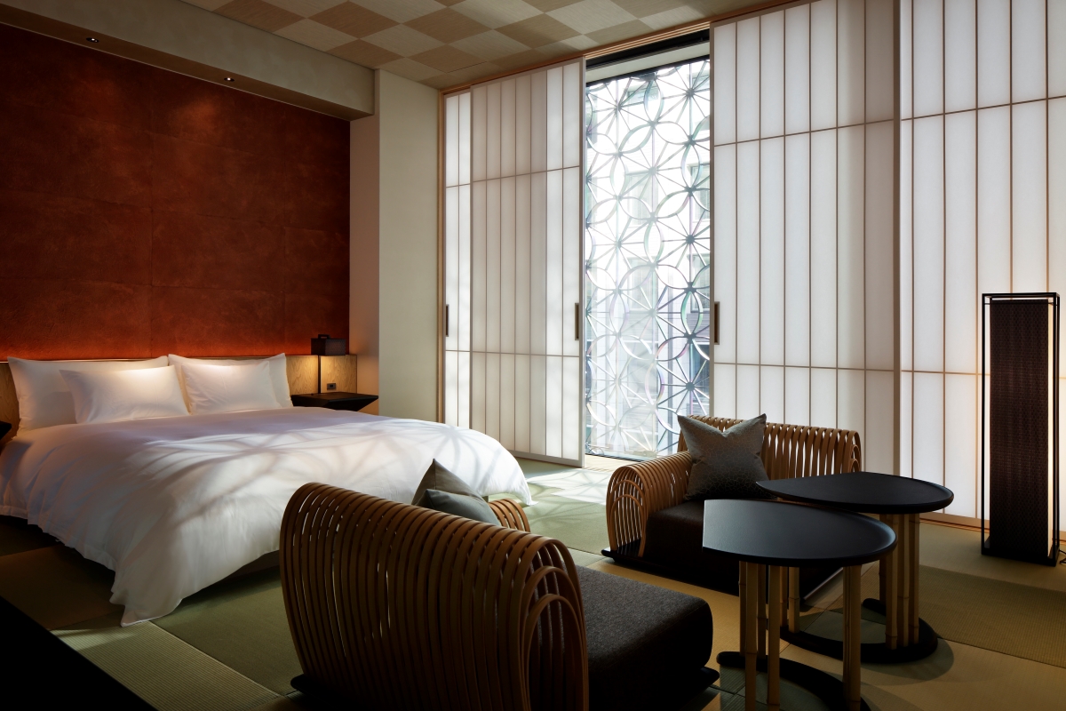 Historically, the Japanese ryokan has been an extremely private space designed for visitors to relax deeply and truly feel at home. Unlike the concept of a "guest" in Western accommodations, a ryokan encourages visitors, upon leaving their footwear at the entrance, to spend their time barefoot and at ease, much like the residents of the household. HOSHINOYA Tokyo honors this tradition: guests remove their shoes at the entrance, and no slippers are provided, allowing for direct contact with the scent and the texture of the tatami mats. Past the small garden at the entrance and through the large cypress door, the seasonal display on the bench, which reflects the Japanese calendar, comes into view. Experiencing the changing seasons in every detail is a unique aspect of the Japanese ryokan. The interior is almost entirely connected by tatami flooring. Guest rooms feature natural materials like tatami, Japanese paper (washi), and bamboo closets. The building's exterior is covered in a delicately patterned lattice, designed with a traditional Japanese motif. While blending into the office district as a sleek, dark building, a closer look reveals the refined Japanese design, clearly identifying the property as a ryokan.A specially designed kimono-style room wear, created by Jotaro Saito, is provided in the guest rooms. It can be used not only for moving around the ryokan but also as street wear for walks or quick errands in the Otemachi, Imperial Palace, or Kanda areas. Each of the 14 guest room floors is designed to evoke a small, self-contained ryokan, featuring six guest rooms and the shared OCHANOMA Lounge. This stacking of individual ryokans forms the overall concept of the "Tower of Ryokan." As each floor is a semi-private space accessible only to its registered guests, a deeply relaxed atmosphere is fostered.