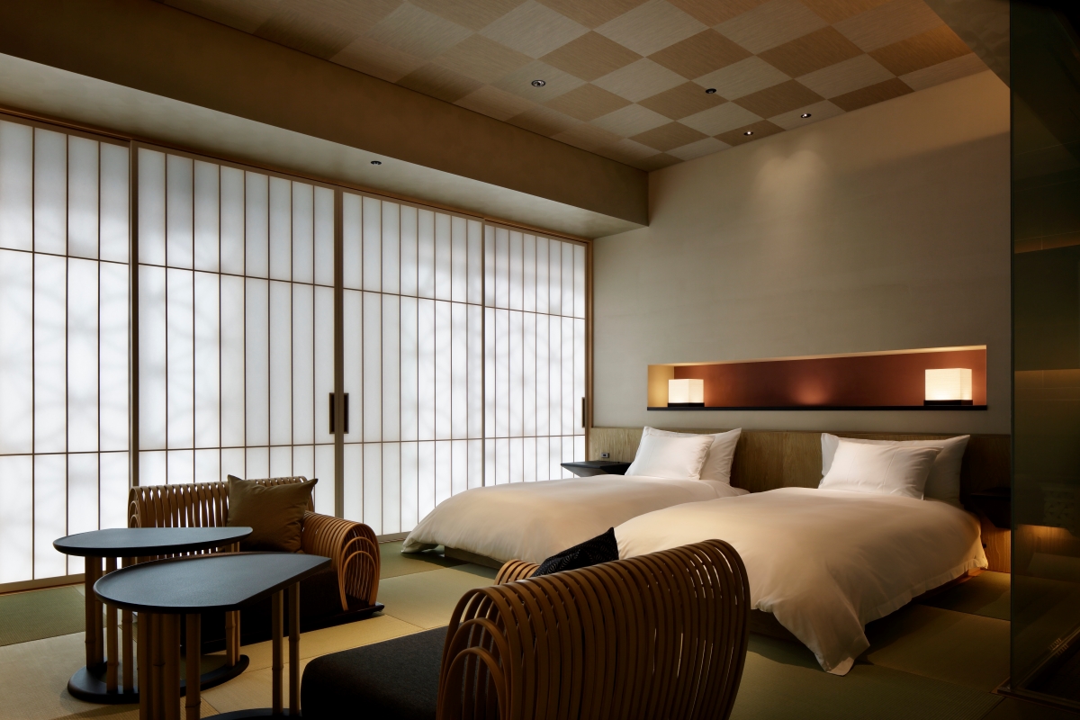 The most spacious room, the Kiku (Executive Triple), accommodates up to 3 guests and offers approximately 80 sqm. This corner room, located at the end of each floor, includes a dining table and a walk-in closet, making it highly recommended for longer stays. The Yuri (Deluxe King) and Sakura (Deluxe Twin) rooms, approximately 45 sqm and accommodating up to 2 guests, are traditional Japanese-style rooms featuring furnishings made from bamboo and chestnut, and thick paper screens. Guests can fully relax on the low-slung tatami sofa and the original bedding. These rooms are available in two types: King (Yuri) and Twin (Sakura).
