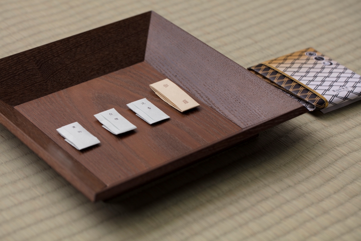 Using a modern incense burner, guests "listen" to the scent to distinguish the subtle differences between three types of aromatic wood.