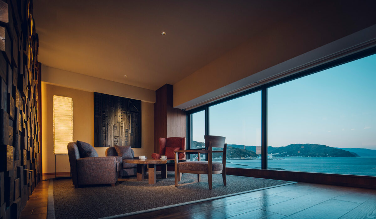 All 45 rooms offer ocean views. Each room has a different design, with artwork related to ships decorating the comfortable space of a low bed and sofa. The interior of KAI Anjin, including the guest rooms, was designed by Super Potato, a design firm that has worked on numerous commercial spaces. The artwork incorporates rudders and oars that were once used for navigation, evoking the romance of the sea, and KAI's original bedding, "Fuwa-kumo Sleep," invites guests to a comfortable rest.