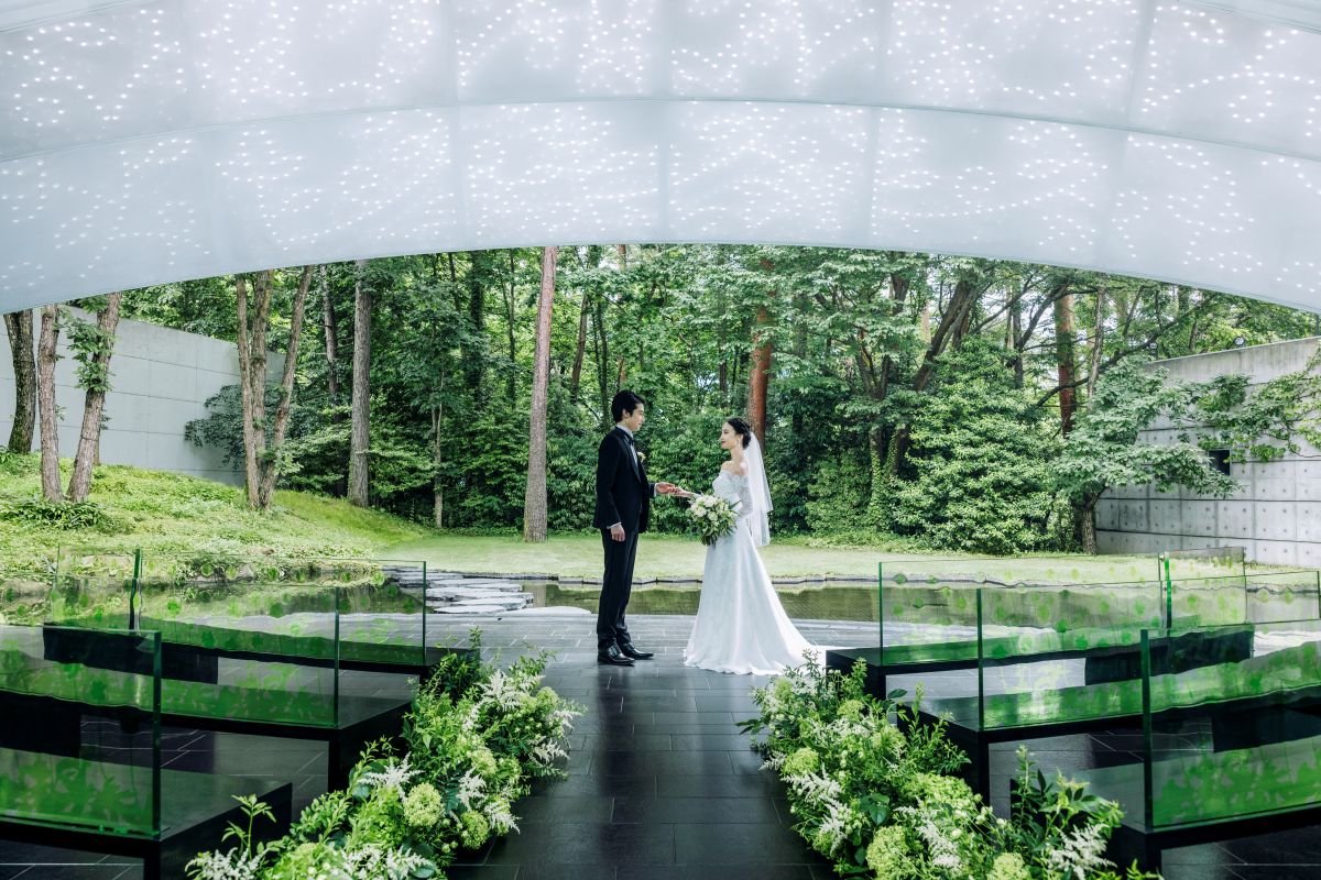 The Garden Chapel “ZONA” is inspired by the image of two leaves drifting down from the sky, meeting and overlapping—a poetic symbol of the serendipitous encounter that brings two people together. When the ceiling opens, light pours in and a lush green landscape unfolds, creating a breathtaking setting unlike any ordinary day. As evening falls, the gentle glow of candles fills the space, transforming it into a scene of quiet, romantic beauty. ZONA is a chapel that reveals two distinct expressions—one in the bright light of day, and another in the soft, enchanting atmosphere of night.