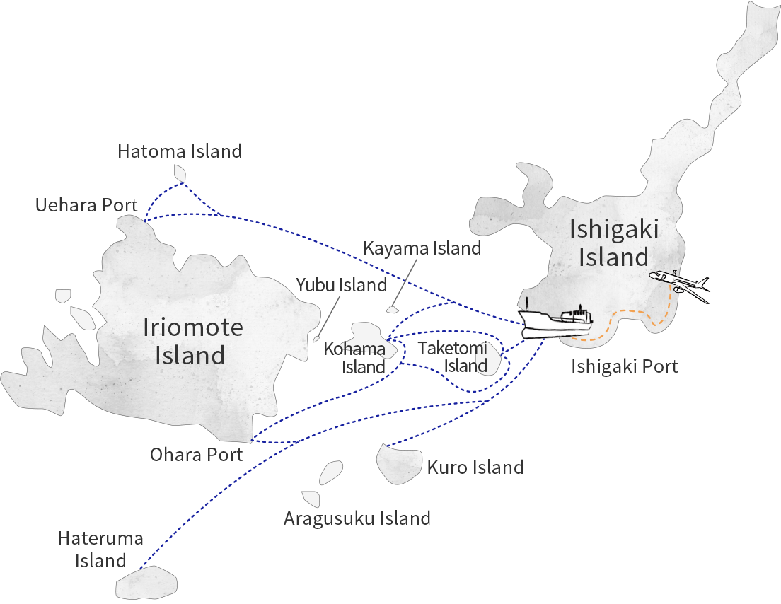 A high-speed boat or ferry from Ishigaki Port can be used to travel. It takes about 10 minutes by a high-speed boat.