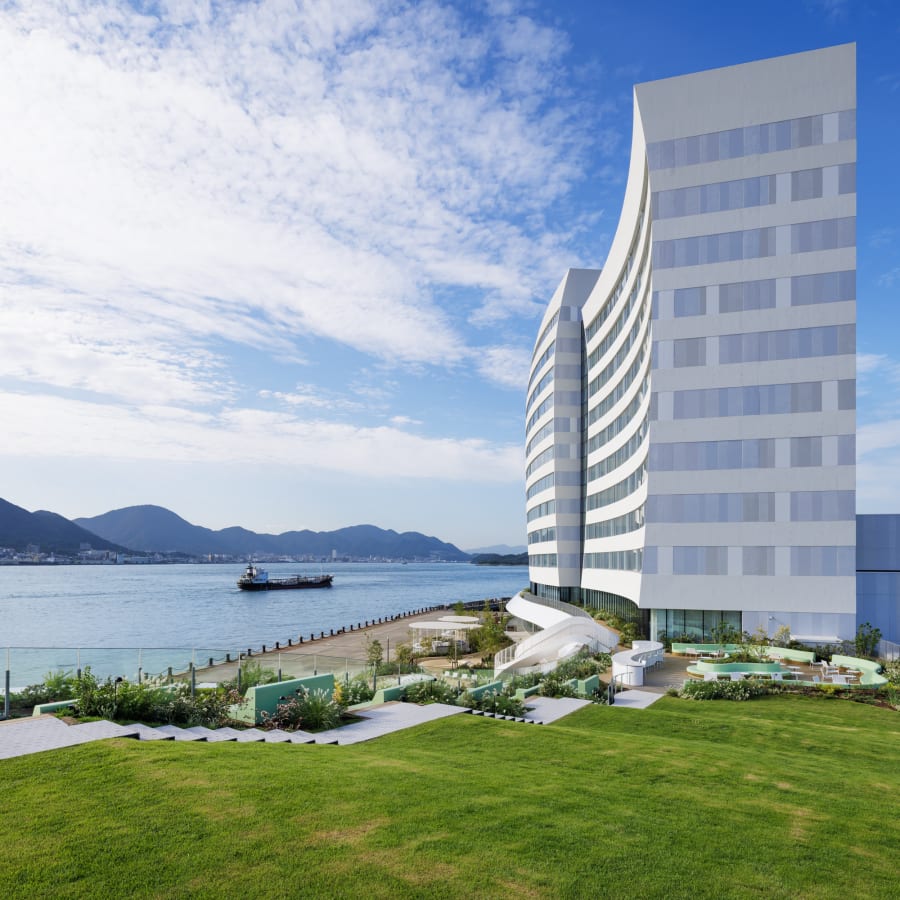 リゾナーレ下関は、「ZEB Ready認証」と「CASBEE建築評価認証」の最高Sランクを国内ホテルで初 めて同時に取得しました。また、ホテル業界の脱炭素化を推進するリーディングプロジェクトとして、 国土交通省の令和5年度「サステナブル建築物等先導事業(省CO2先導型)」(*3)にも採択されています。