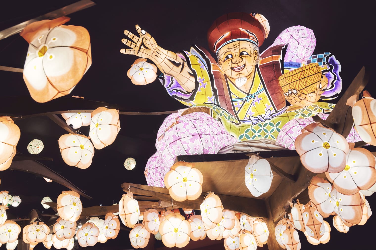 春の青森屋のシンボル、約3mの「ねぶた花咲かじいさん」が咲かせたりんごの花型灯篭のもとで、幻想的な花見を堪能できます。