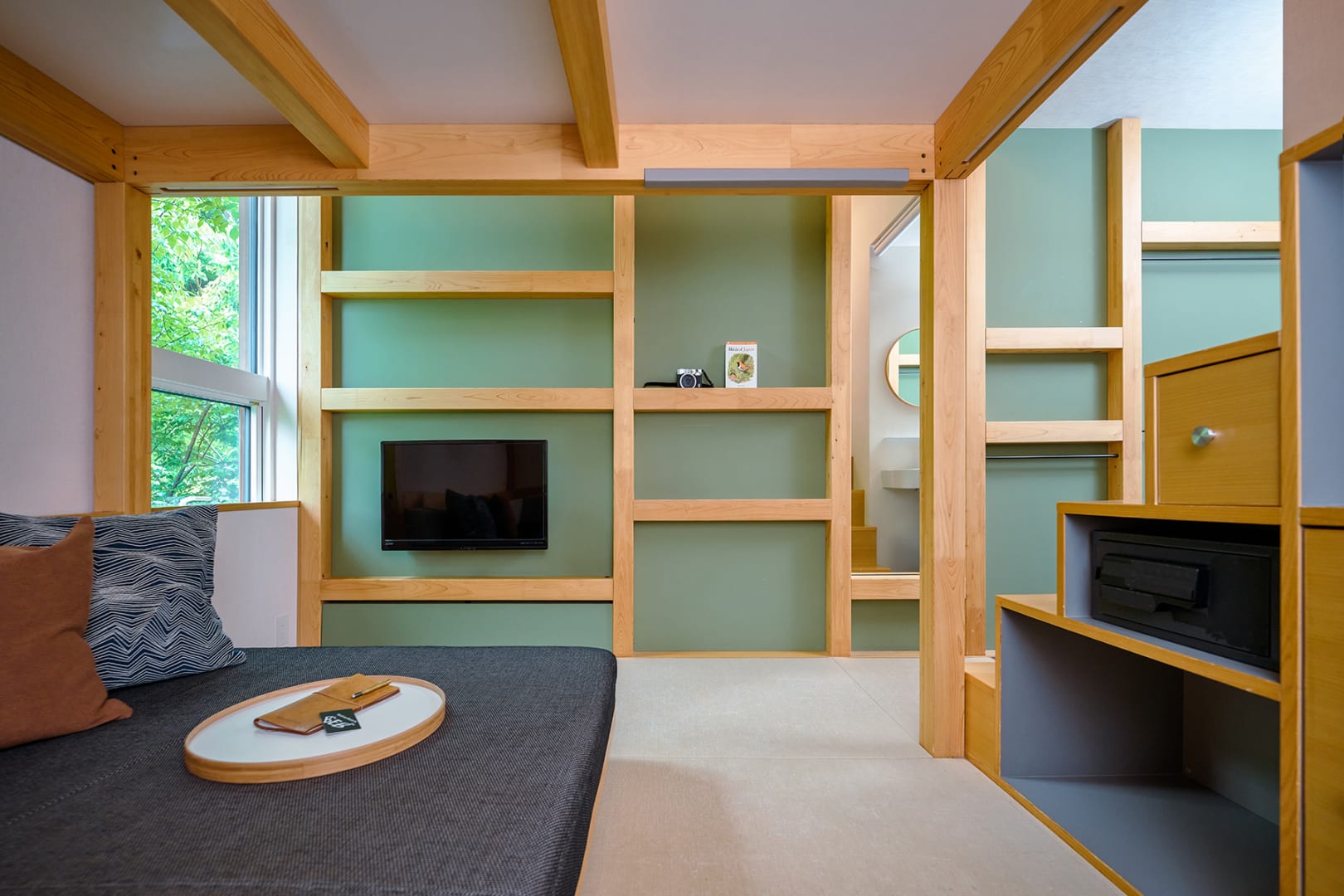 上段はベッド、下段はソファー。まるで秘密基地のような気分で楽しめるお部屋。お菓子や飲み物を持ち込んで、ミニパーティーもオススメです。