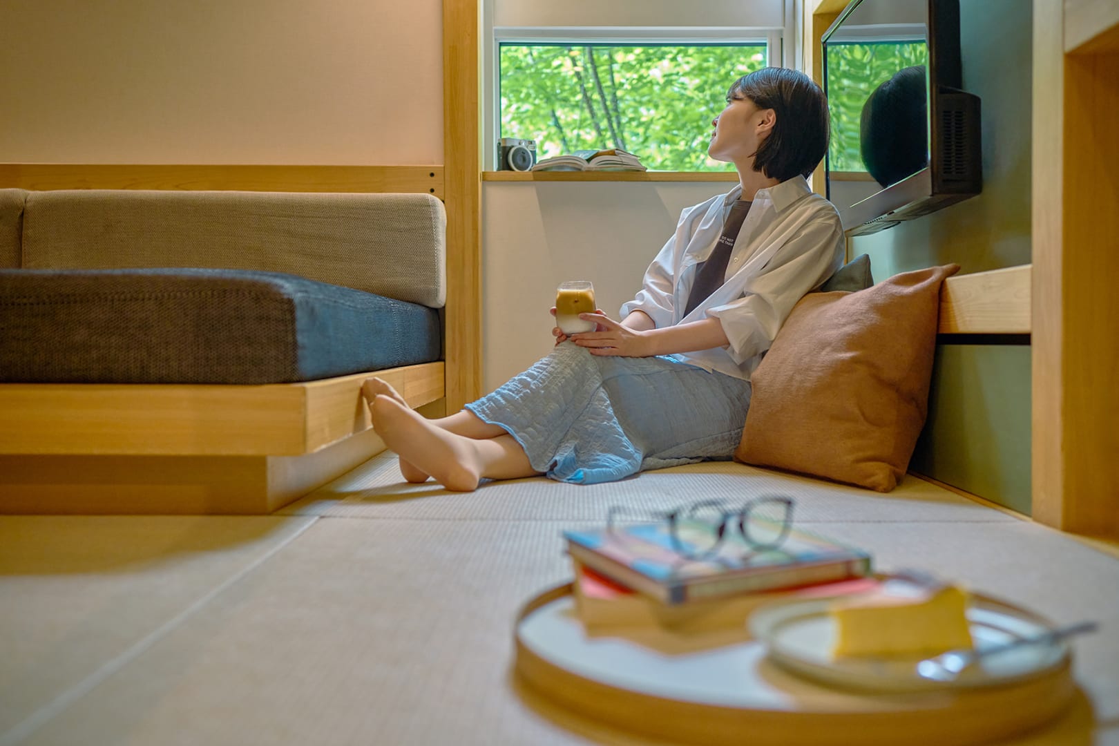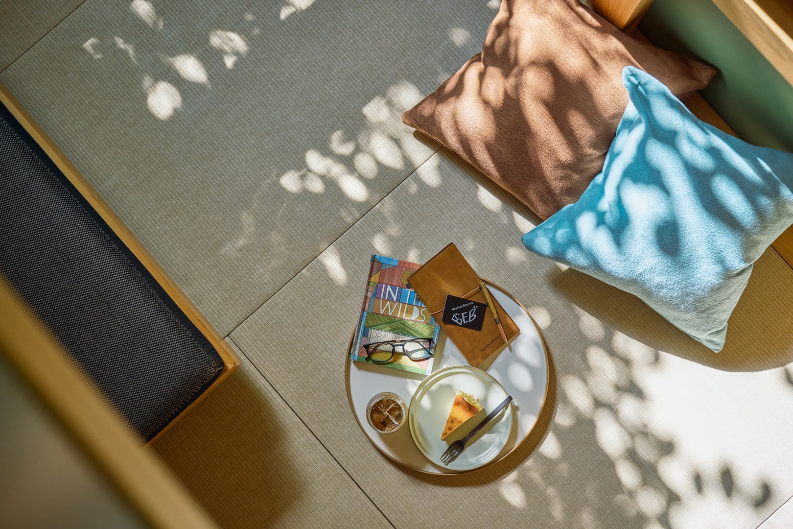 BEBならではの遊び心あふれるラウンジ「TAMARIBA」。併設カフェも24h営業でいつでも楽しく滞在できます。軽井沢の自然感じる屋外ラウンジもおすすめ。好みのクッションやラグを動かして、自分らしい空間アレンジを!