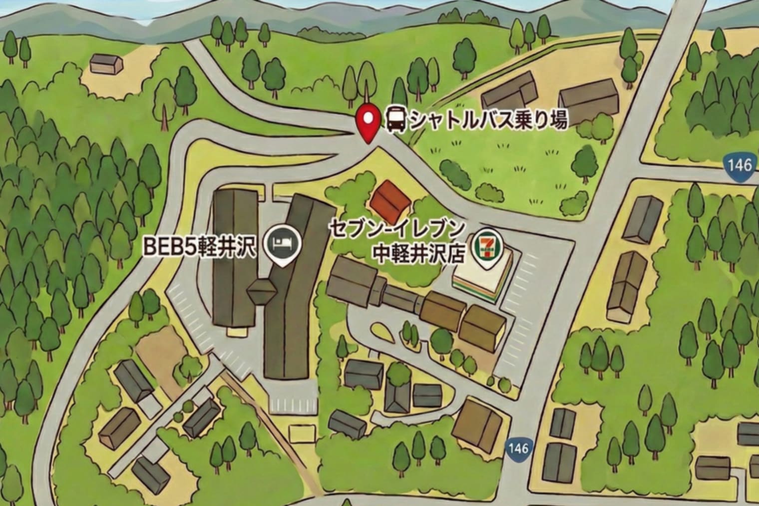 | 所要時間 | ⑤BEB5軽井沢→ 2分 →⑥ハルニレテラス南→ 2分 →⑦星野温泉トンボの湯→ 4分 →①星のや軽井沢→ 2分 →②星野温泉トンボの湯→ 2分 →③ハルニレテラス北→ 6分 →④軽井沢ホテルブレストンコート→ 2分 →⑤BEB5軽井沢 |