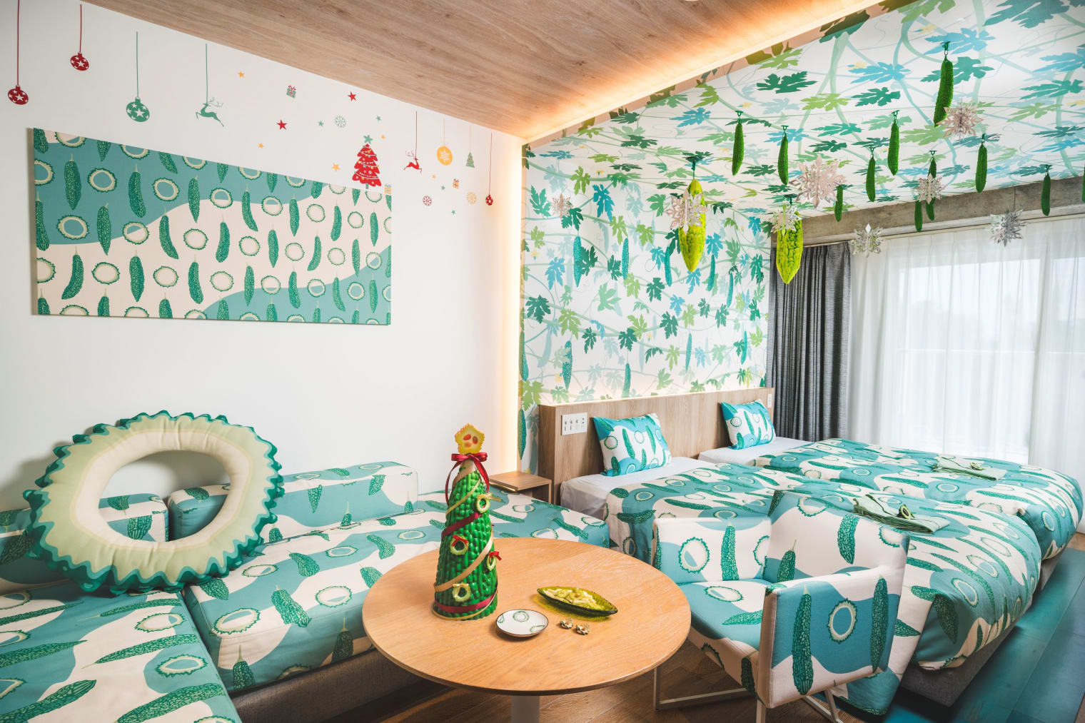 限定1室の「ゴーヤールーム」が、期間限定でクリスマス仕様になります。旅先でのクリスマスを、ゴーヤー尽くしの特別な空間で満喫できます。