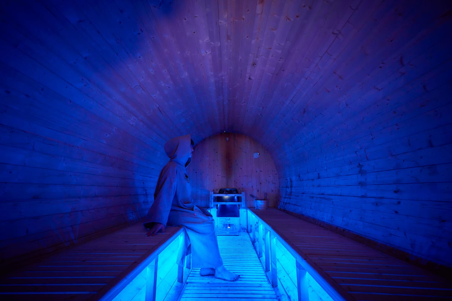 海をイメージしたやわらかなブルーのライトがサウナ内を包み、落ち着いた空間となります。