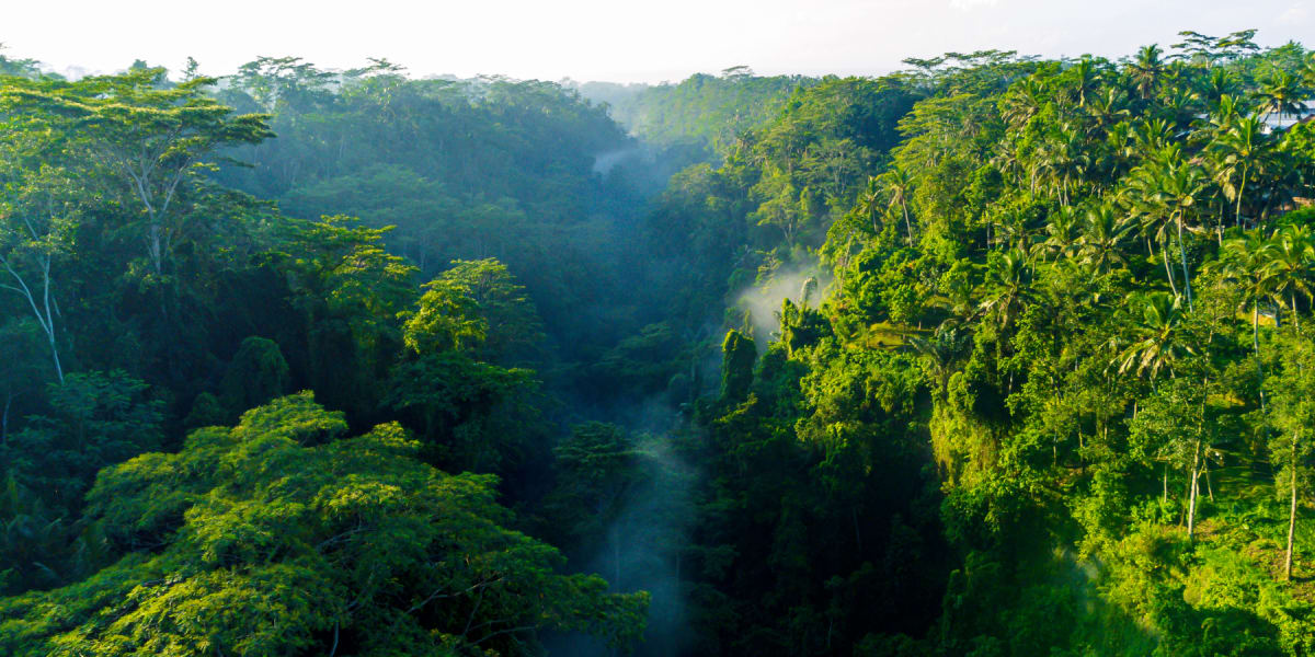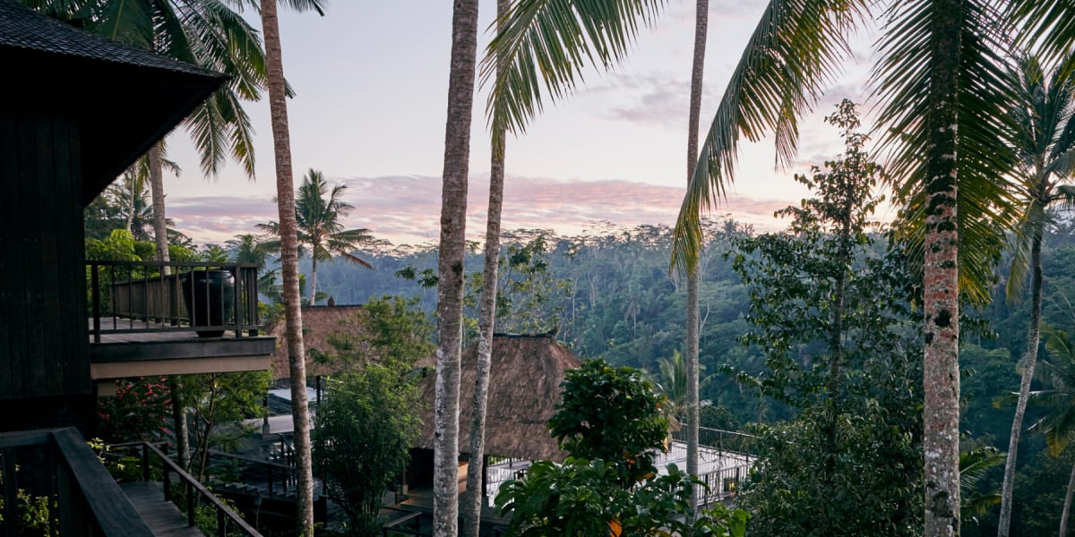 熱帯雨林の渓谷を見晴らす開放的で広いテラスを備え、フラットな作りの特別室