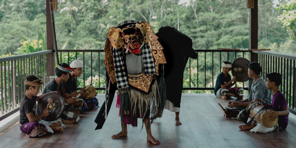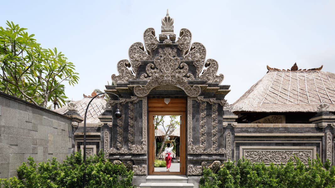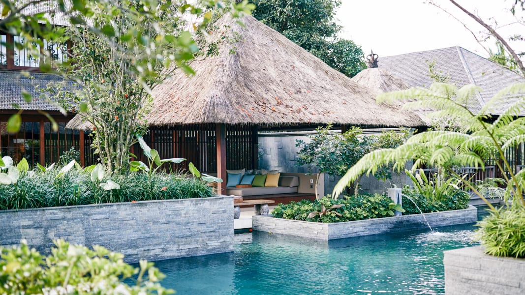 バリの伝統建築様式のヴィラは、川を模したロングプールにゆるやかに繋がります。