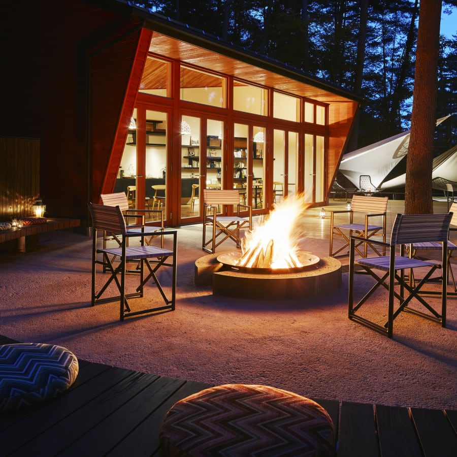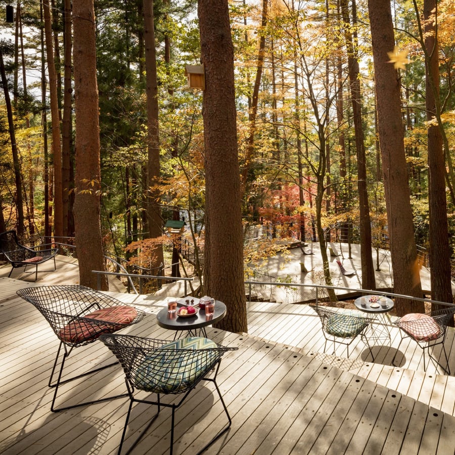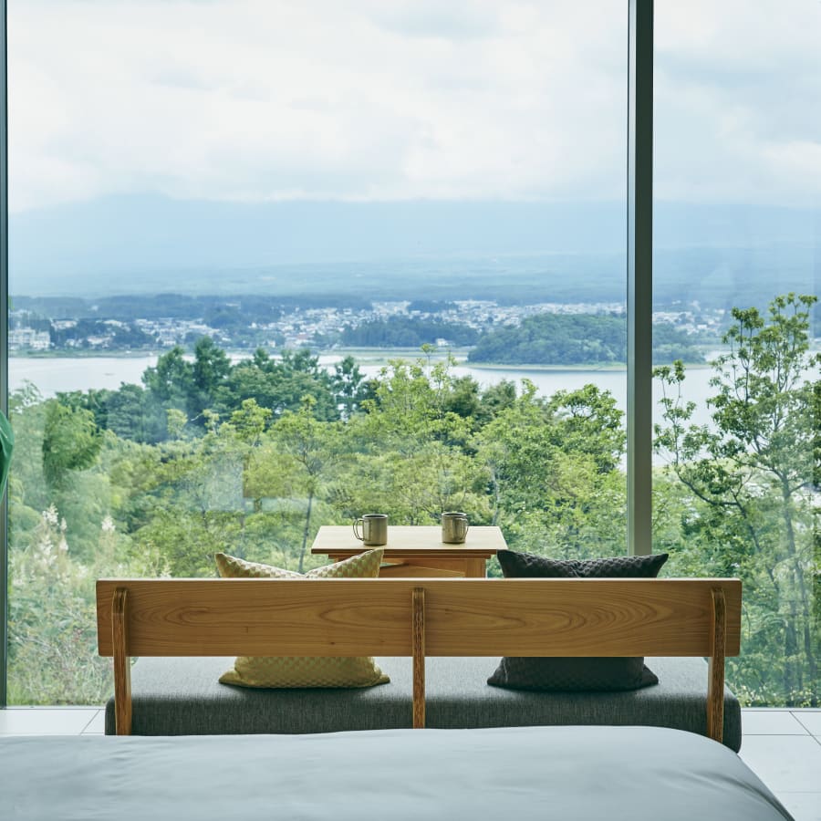 国立公園の特別地域、緩やかな丘陵に広がる約6haの森を抱く星のや富士。足を踏み入れれば、木漏れ日が揺れる小径の先々にチェアやハンモックがしつらえられ、富士北麓を彩る秋の森を独り占めする贅沢な時間が流れます。