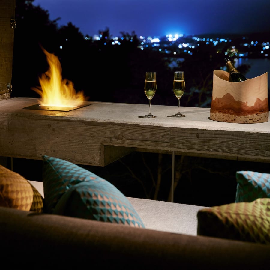 フレッシュミントと桃のコンポートを使った星のや富士オリジナルのモヒートを片手に、静かな夜の森を五感で楽しめます。