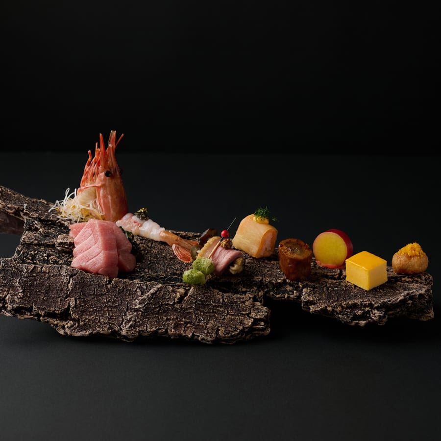 八寸とお造りを一つの器に盛り込み、山と海の幸を一堂に会した華やかな盛り合わせとして、宝楽盛に仕立てました。何から箸をつけようかと迷う、その瞬間から食の楽しさが始まります。