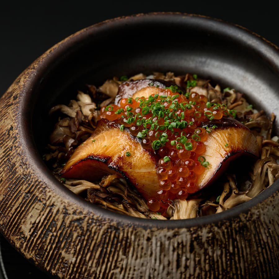 低温で焼き上げ、旨味を凝縮させた数種のきのこは、こりこりとした心地よい食感が楽しめます。そこに、冬に旬を迎える鰤を柚子の香り豊かな幽庵地に漬け込み、ふっくらと香ばしく焼き上げました。