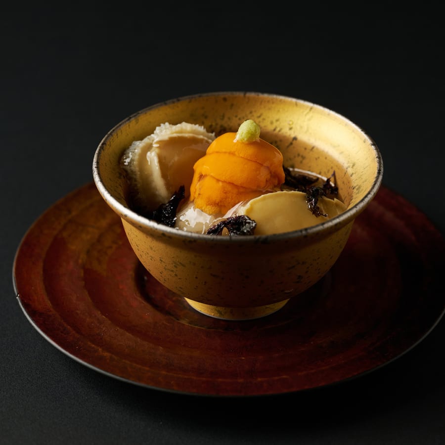 台湾でスープなどに多用され、力強い旨味を持つ岩海苔。その魅力を日本料理に活かすべく、伝統的な先付「飯蒸し」に香り高い餡としてあしらいました。共に蒸しあげた柔らかな鮑の食感と、ウニの濃厚な甘みが加わることで、幾重にも重なる海の恵みを堪能できる一品です。
