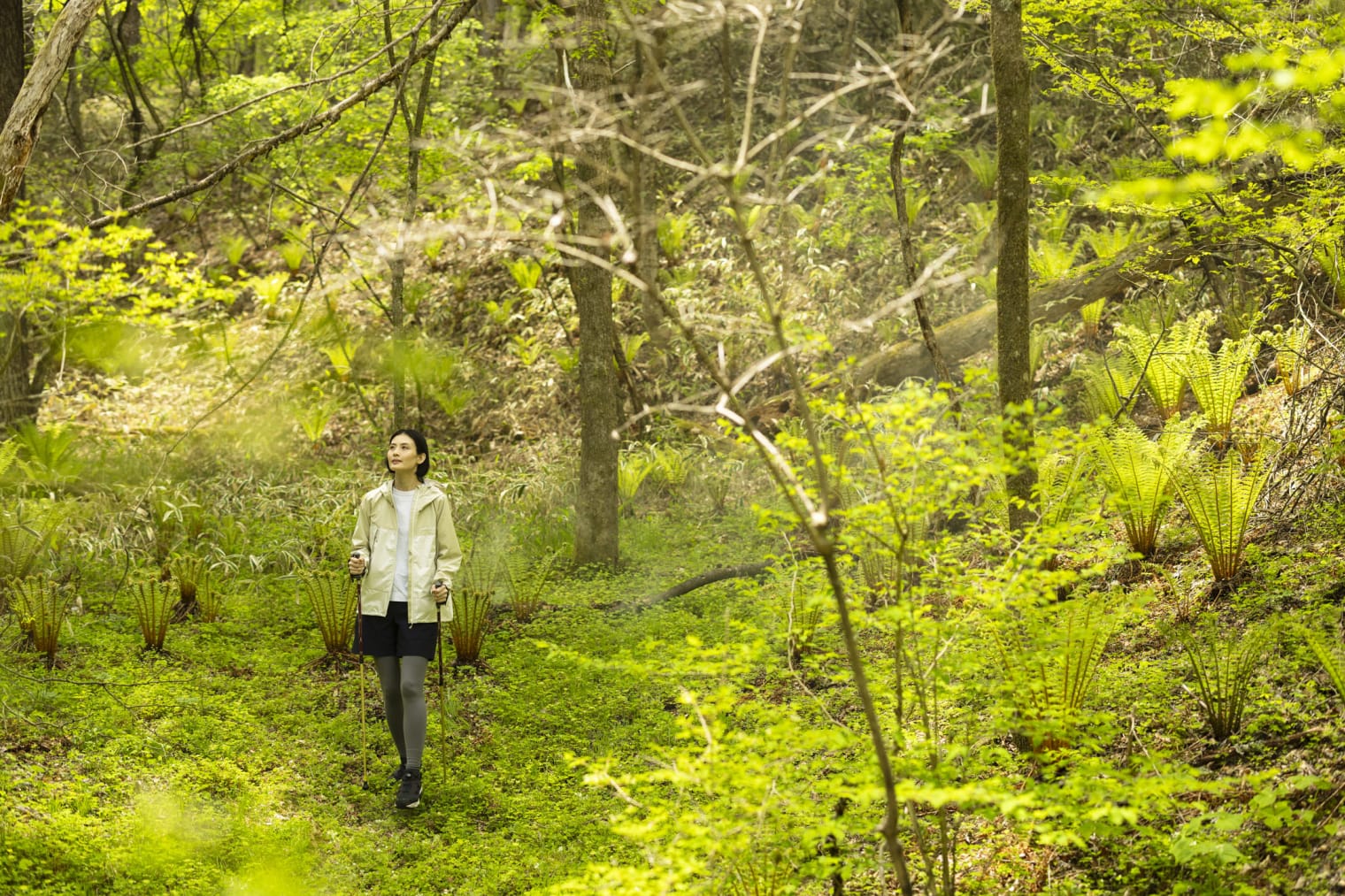 四季折々の美しい情景が広がる軽井沢の森で、自身の内面に意識を向けるマインドフルネスな森林浴ウォーキング。足腰に負担をかけずに高い運動効果が期待できるノルディックポールを使い、専門スタッフがサポート。