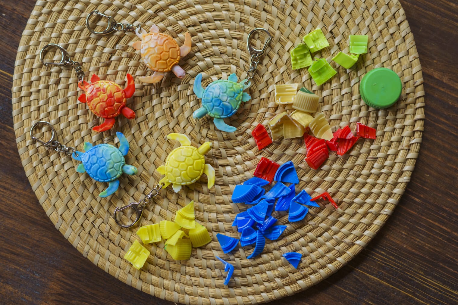 ビーチに流れ着いた素材から生まれた、ウミガメのかたちをしたキーホルダー。一度捨てられてしまったものが、価値のあるものに生まれ変わる、資源リサイクルの可能性を感じることができます。