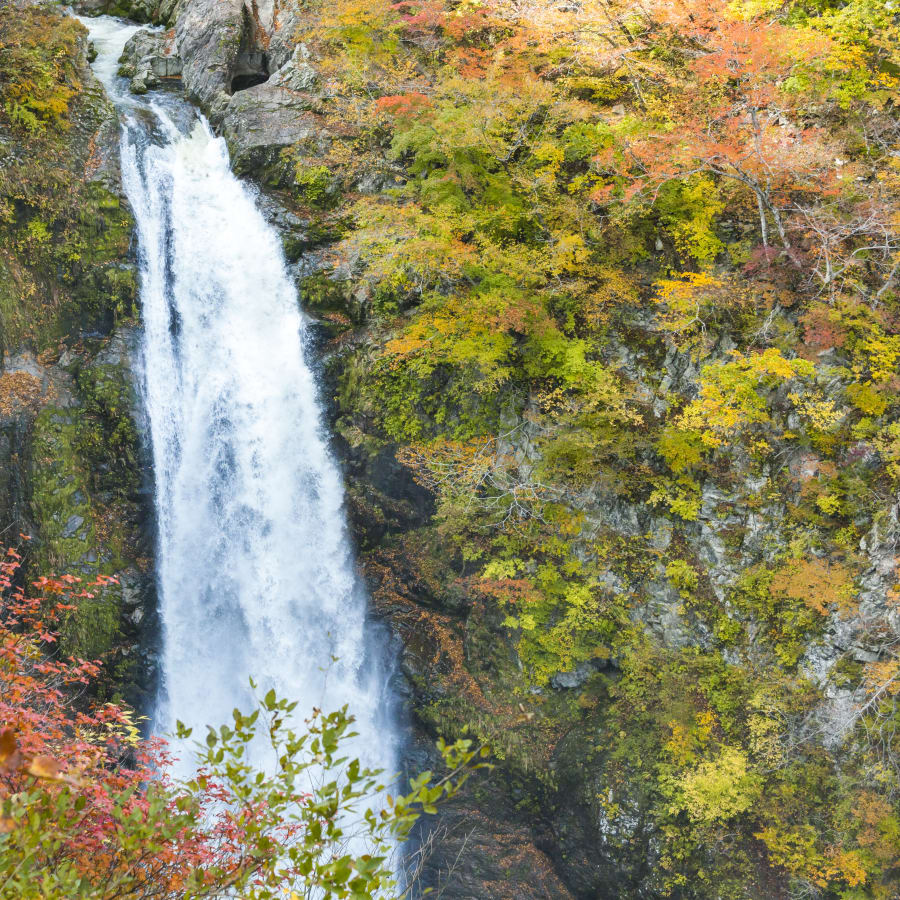 滝見台からは、その雄大な姿を一望できるほか、不動滝橋の脇から整備された遊歩道を下って、約5~10分で滝つぼまでアクセス可能。