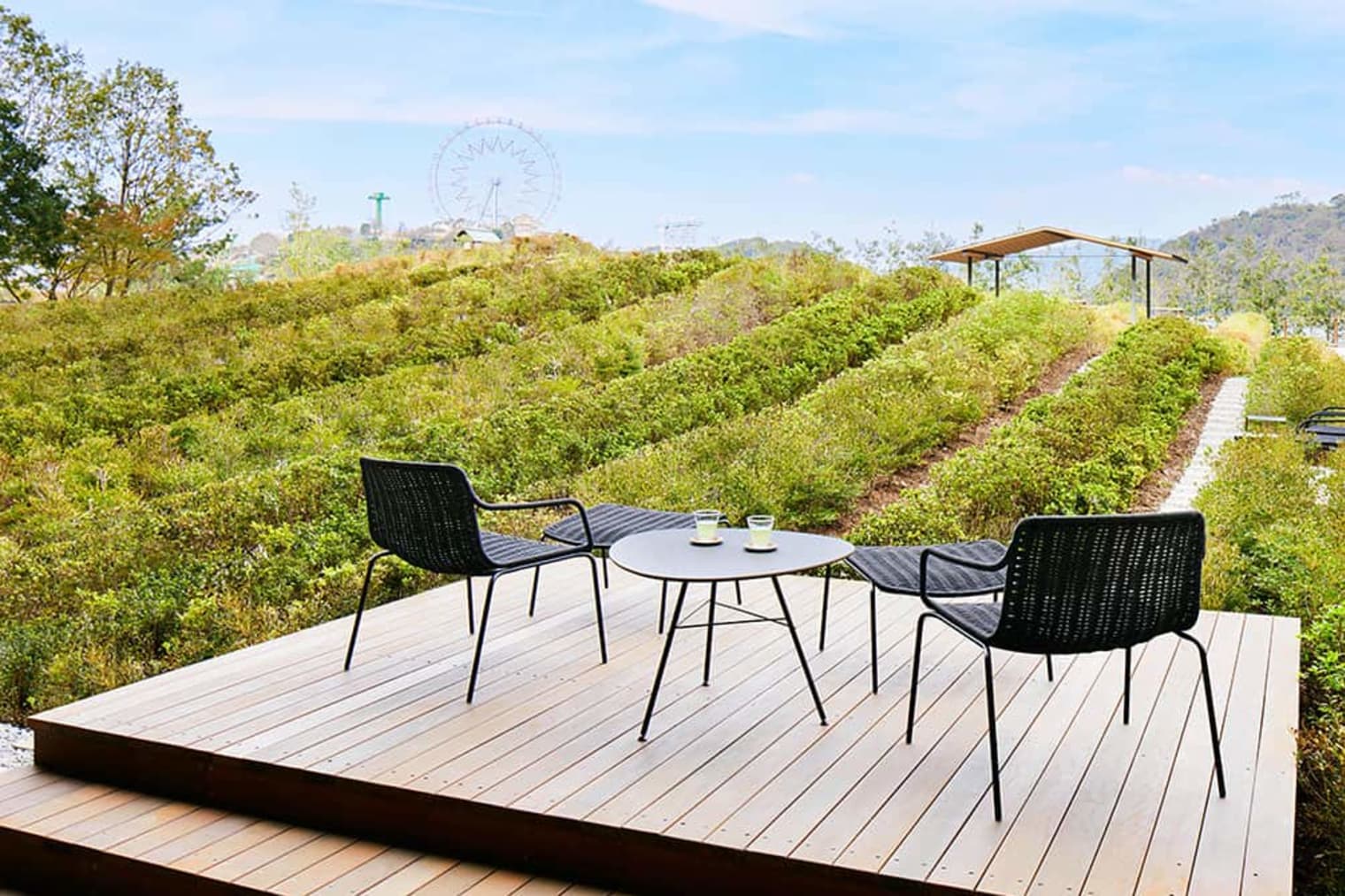 「つむぎ茶畑」では、目の前に広がる浜名湖の雄大な景色と縞柄模様が美しい茶畑が調和した風景を望むことができます。