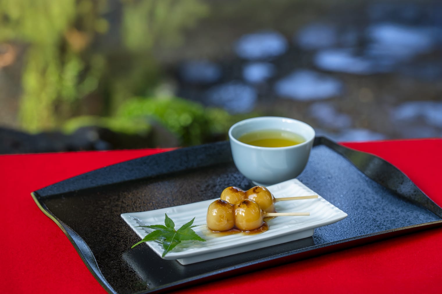 宿に到着後は、スタッフが茶屋の主人として、お茶と和菓子をふるまい、夕食後には、ハーブティーやお酒を用意いたします。湯上がりのひとときや、出発前のつかの間の休息など、ご滞在中に何度でも立ち寄りください。