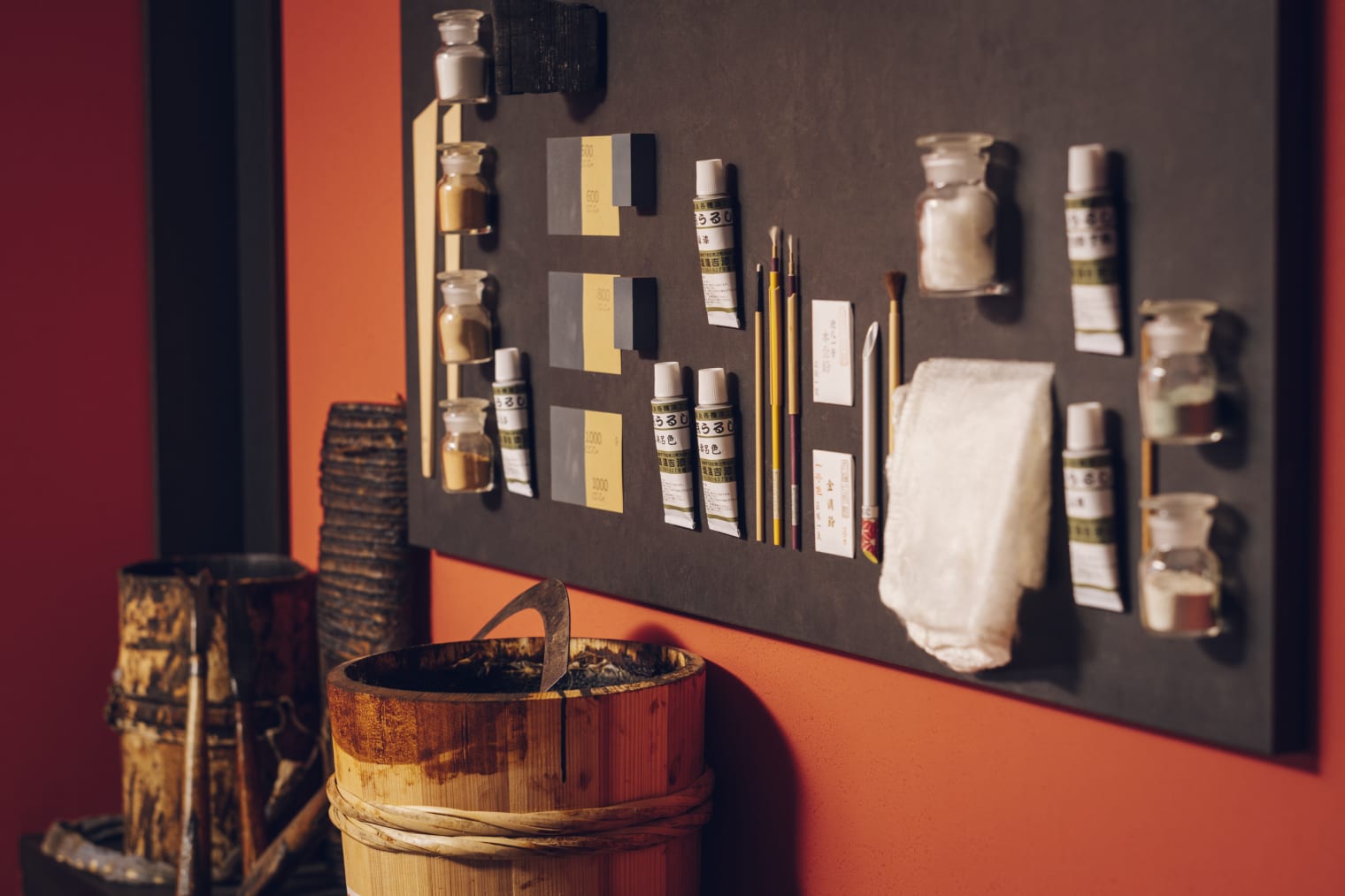 欠けた器を漆のパテで埋める「埋め」や金粉を蒔く「粉蒔き」など一部工程を体験いただけます。
