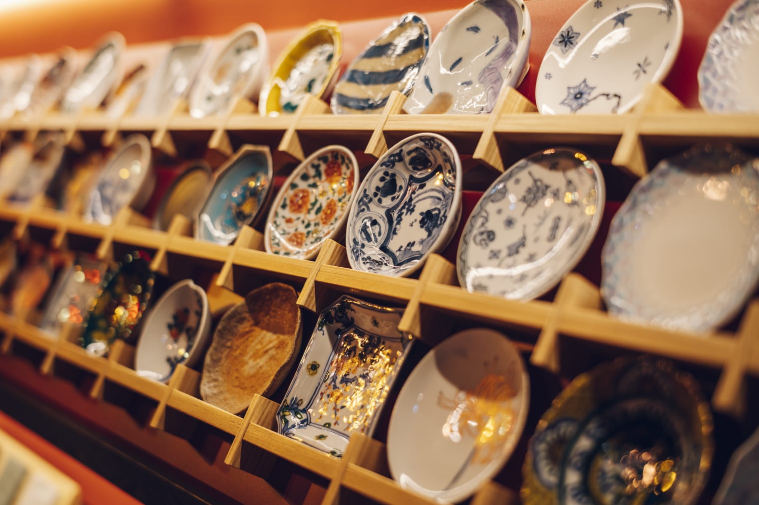 「九谷焼」や「山中塗」など約100種類の器の中から自分好みの器や酒器をお選びいただくことができます。