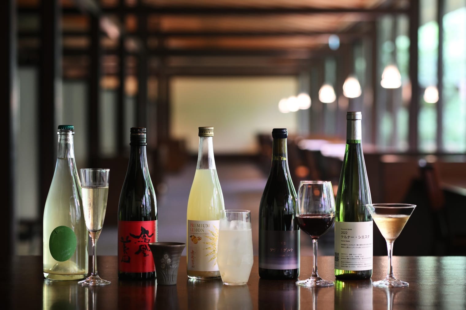 夕食は半個室の食事処でお食事ができます。本プランの「おひとりたしなみペアリング」では、ご当地の日本酒やワインなどを少量ずつご提供します。