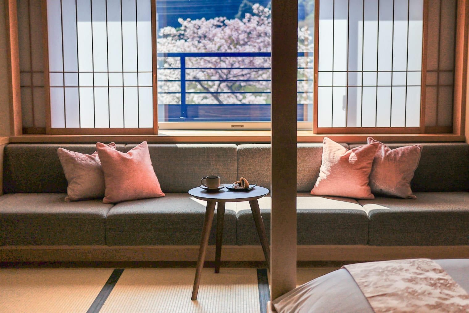 春になると、界 長門の前を流れる音信川沿いに、桜並木が咲き誇り、温泉街を華やかに彩ります。多くの人々を魅了してきたこの桜を心ゆくまで堪能できるよう、滞在中いつでも花見を楽しめるよう工夫しました。