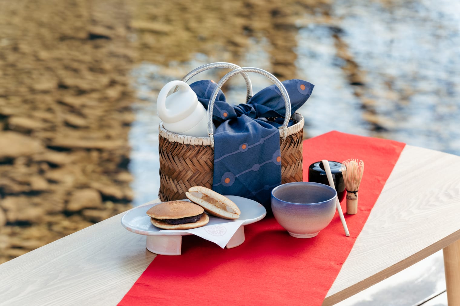 静かな朝の桜を眺めながら特別なひとときを過ごせるよう、界 長門の目の前にある「あけぼの橋」に特等席をご用意しました。そこで体験できるのは、格式高い「深川萩(ふかがわはぎ)」の器で楽しむ野点体験です。深川萩は江戸時代から多くの茶人に愛されてきた萩焼の中でも、特に格式が高いとされます。抹茶のおともには、桜の時期限定のさくら餡の入ったどら焼きを提供します。ご自身で点てた抹茶とともに、目の前に広がる桜を愛でる贅沢な時間を過ごすことができる体験です。