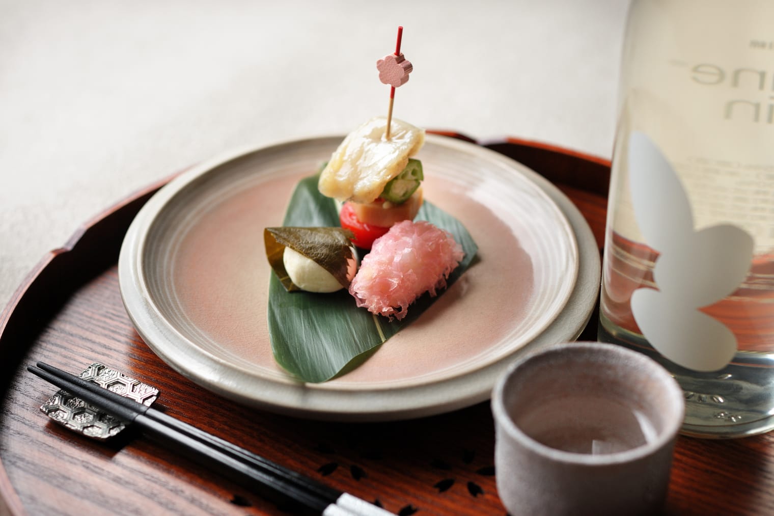 山口県名産品であるふぐを使用し、春をイメージしたおつまみを3種類準備しました。ふぐの生ハム、香煎揚げ、雲丹とクリームチーズの桜餅を萩焼の器に盛ってご提供。また、アペロのお供となるお酒には、ふぐの淡白な味わいと相性のよい、山口県美祢市の酒造の日本酒をお楽しみください。