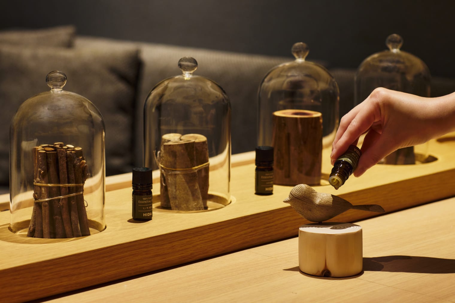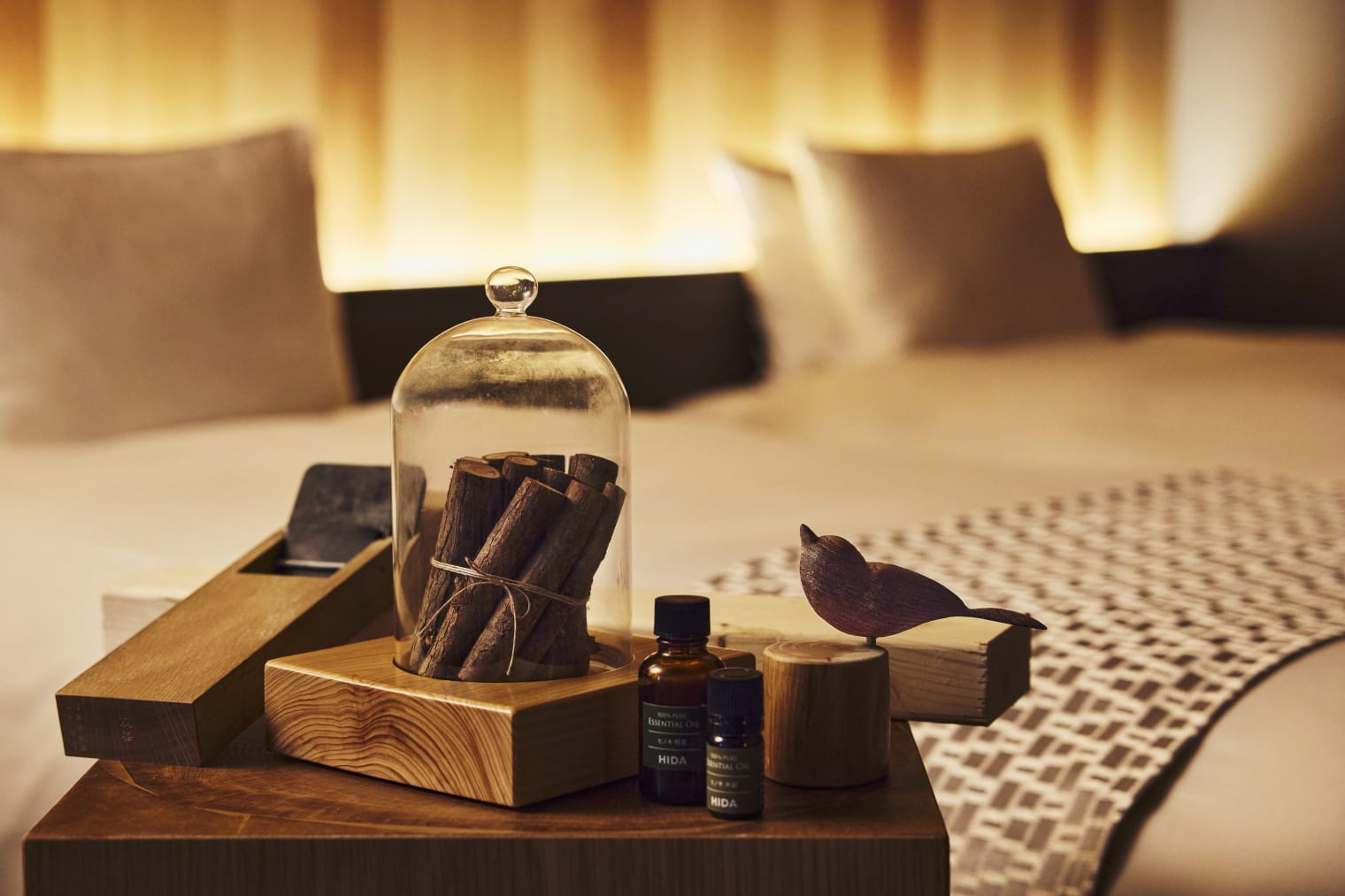 就寝前は、飛騨の木工文化が息づくご当地部屋「飛騨MOKUの間」で、温もりある飛騨家具に囲まれてリラックスできます。また、飛騨産業が手掛けた4種のエッセンシャルオイルの香りを聞き比べ、気に入った香りをディフューザーに垂らして、心地よい眠りの空間を整えます。