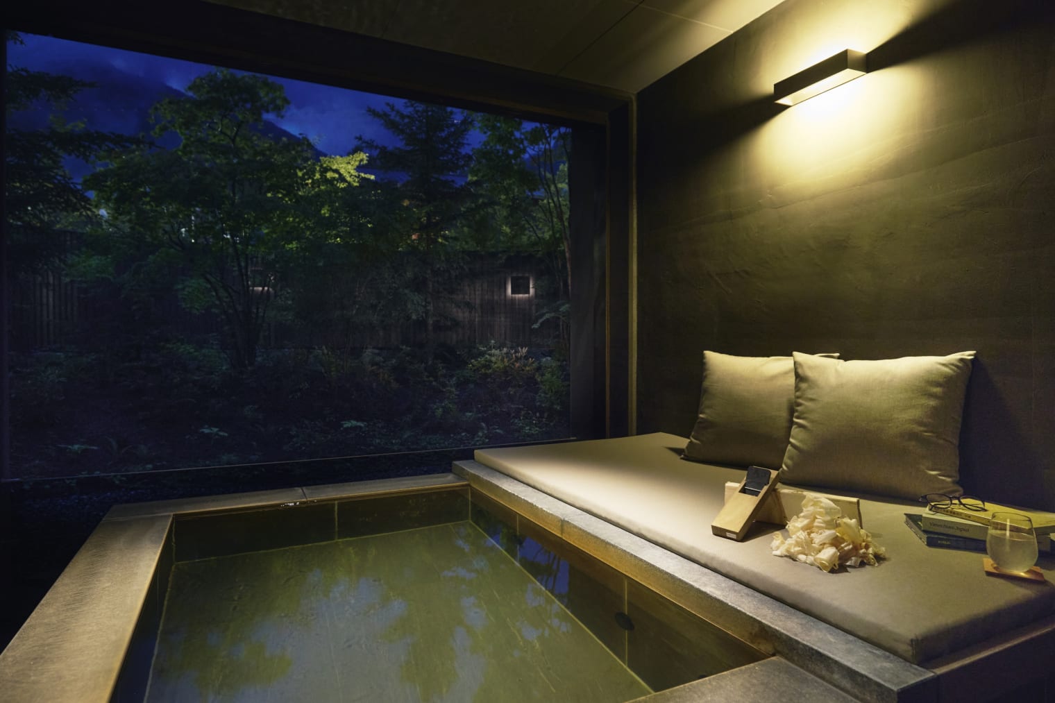 本プランでは、ご自身でカンナを使って「飛騨檜(ひだひのき)」で入浴用の薄皮を刷り出す「カンナ体験」を用意しました。体験後、削りたての新鮮な檜をお風呂に浮かべることで、温泉の泉質と檜の爽やかな香りが互いを引き立て合い、心身を深く解きほぐします。湯上がりには、限定のドリンク「草木炭酸FOREST SODA」を提供します。飛騨産を含む国産の天然香木5種を蒸留・加工したこのドリンクは、まるで雨上がりの森を散策したかのような、しっとりとした木の香りが特徴です。香りで満たされる特別なひとときが、全身を癒します。