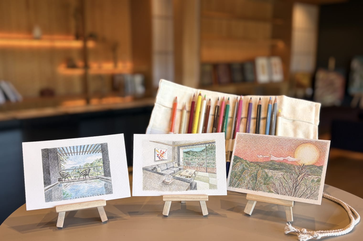 アトリエライブラリーには、界 仙石原オリジナルの塗り絵絵葉書をご用意しております。 箱根の山々や、風にそよぐススキ。その瞬間にあなたの目に映ったままの色彩を、色鉛筆で自由にのせてみませんか。スマホの画面越しに切り取るのとはまた違う、自分の手で選んだ「色」の記憶は、日常に戻った後もその時の情景を鮮明に呼び起こしてくれます。 完成した一枚を旅の思い出にするのはもちろん、切手を添えて、箱根で感じた色をそのまま大切な人へ届けることもできます。