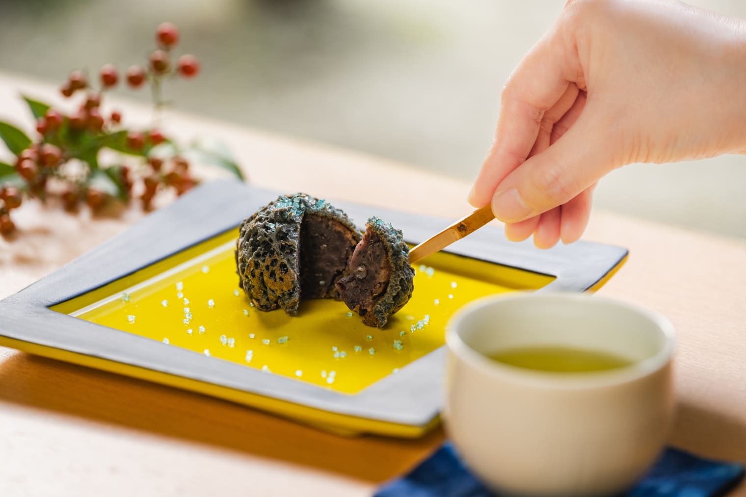 たたら製鉄によって作られる鉄の最上級部分が玉鋼(たまはがね)です。その玉鋼をイメージし、見た目だけでなく、鉄の硬さを意識したシャリシャリした食感の界 玉造オリジナルスイーツを味わうことができます。