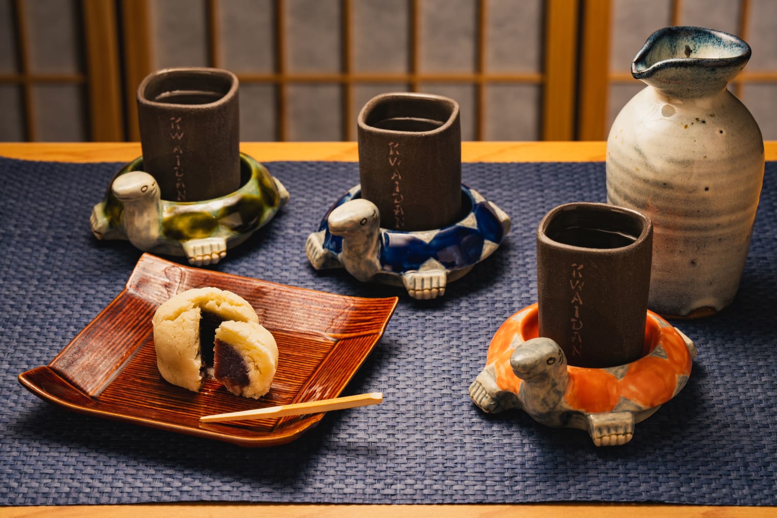八雲が和菓子の「黄身しぐれ」をつまみに晩酌を楽しみにしていたというエピソードから着想を得た「八雲酒セット」を提供します。「黄身しぐれ」は、日本酒の餡を忍ばせた界 玉造オリジナルです。日本酒はにごり酒など3種類を用意。八雲が愛した和菓子とお酒の組み合わせを体験できます。