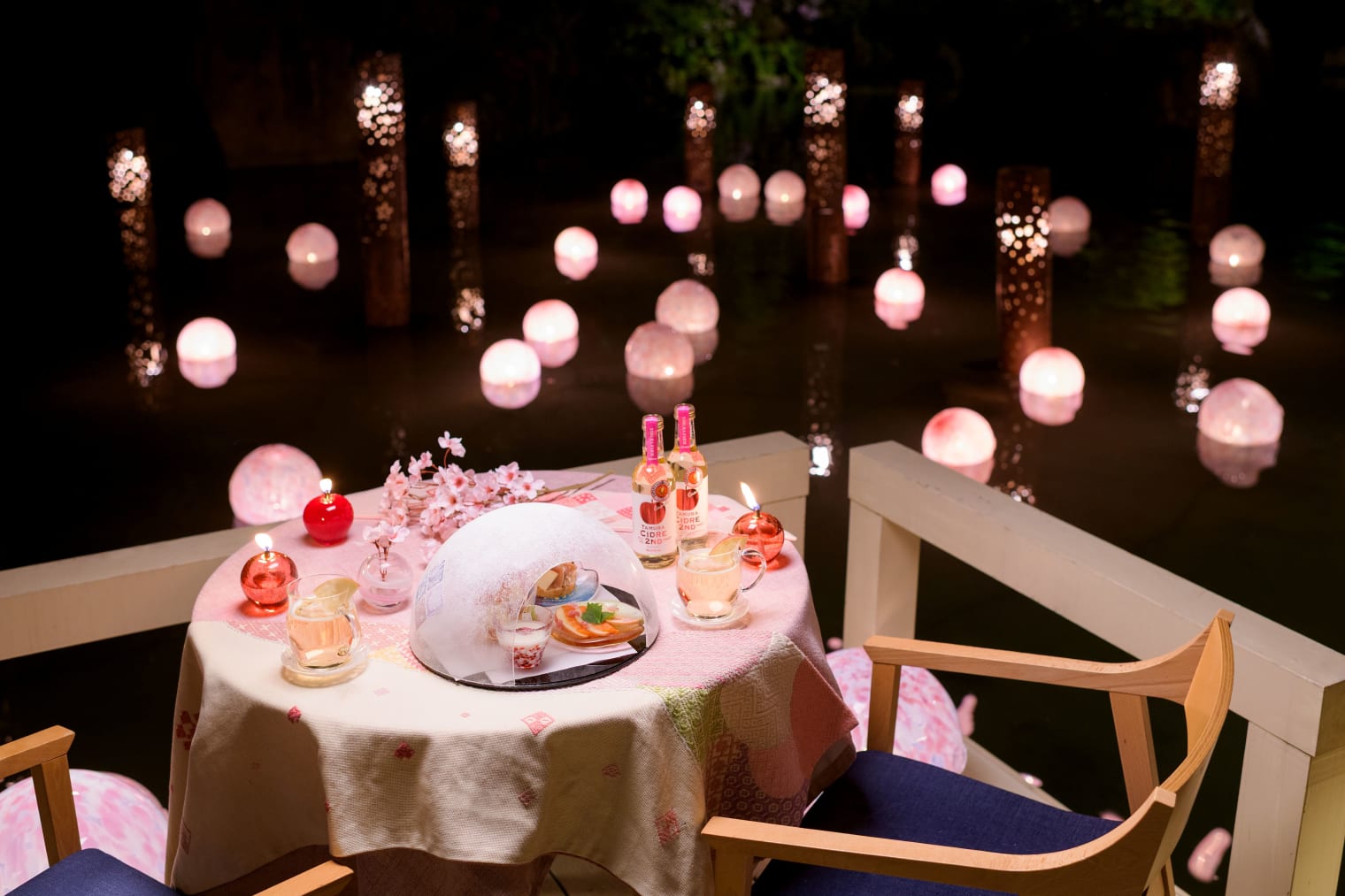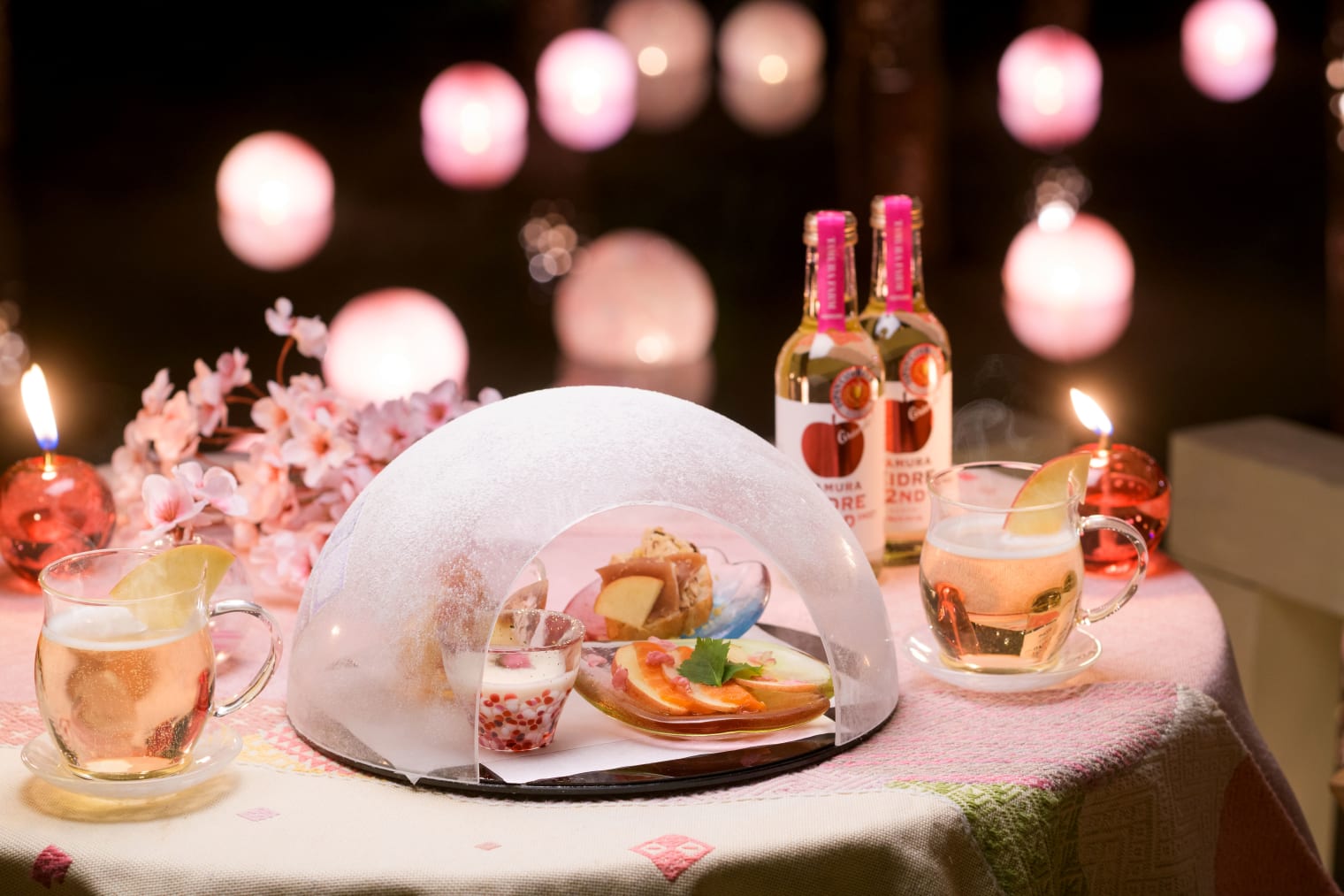 全国的に桜の便りが届く時期、青森では雪解けを待つ季節です。暖かな春を待ちわびる気持ちを込めて、「春待ち桜あかりテラス」を開催いたします。伝統工芸の「津軽びいどろ」や「津軽金山焼」の灯篭を水庭に設えた幻想的な「花明かり」が灯る特等席では、希少な「雪室りんご」を使用した「雪どけアミューズ」をご提供いたします。桜色に染まる水庭を眺めながら、春の訪れをお楽しみください。