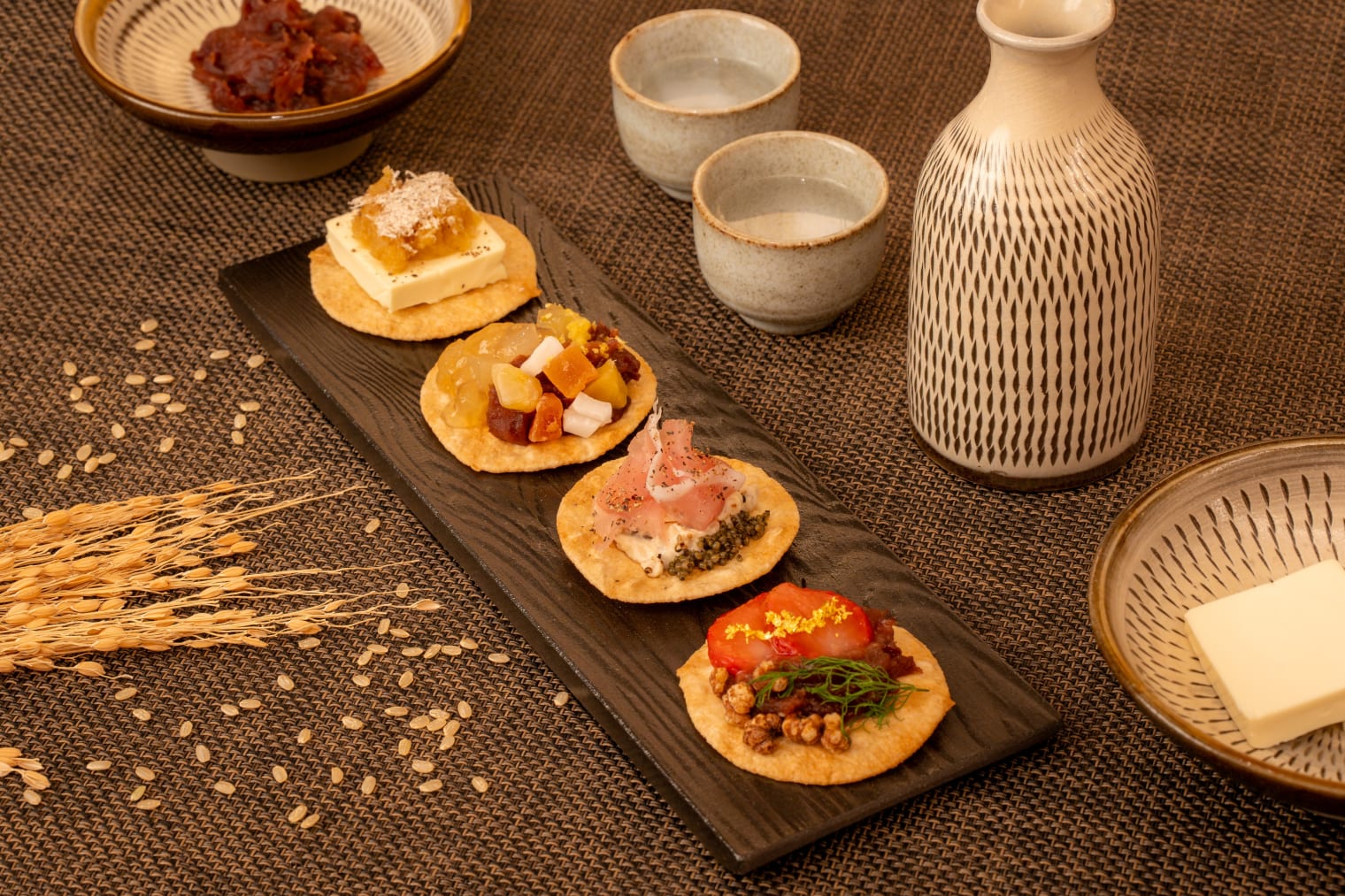「やつがい」とは大分県の方言で晩酌を意味し、本イベントでは大分県の日本酒「くにさき」や本格麦焼酎「とっぱい」を提供します。おつまみには、せんべいにクリームチーズやあんバターを塗り、大分名産の椎茸や梨をトッピングした「せんべいディップ」というユニークな一品をご用意しています。