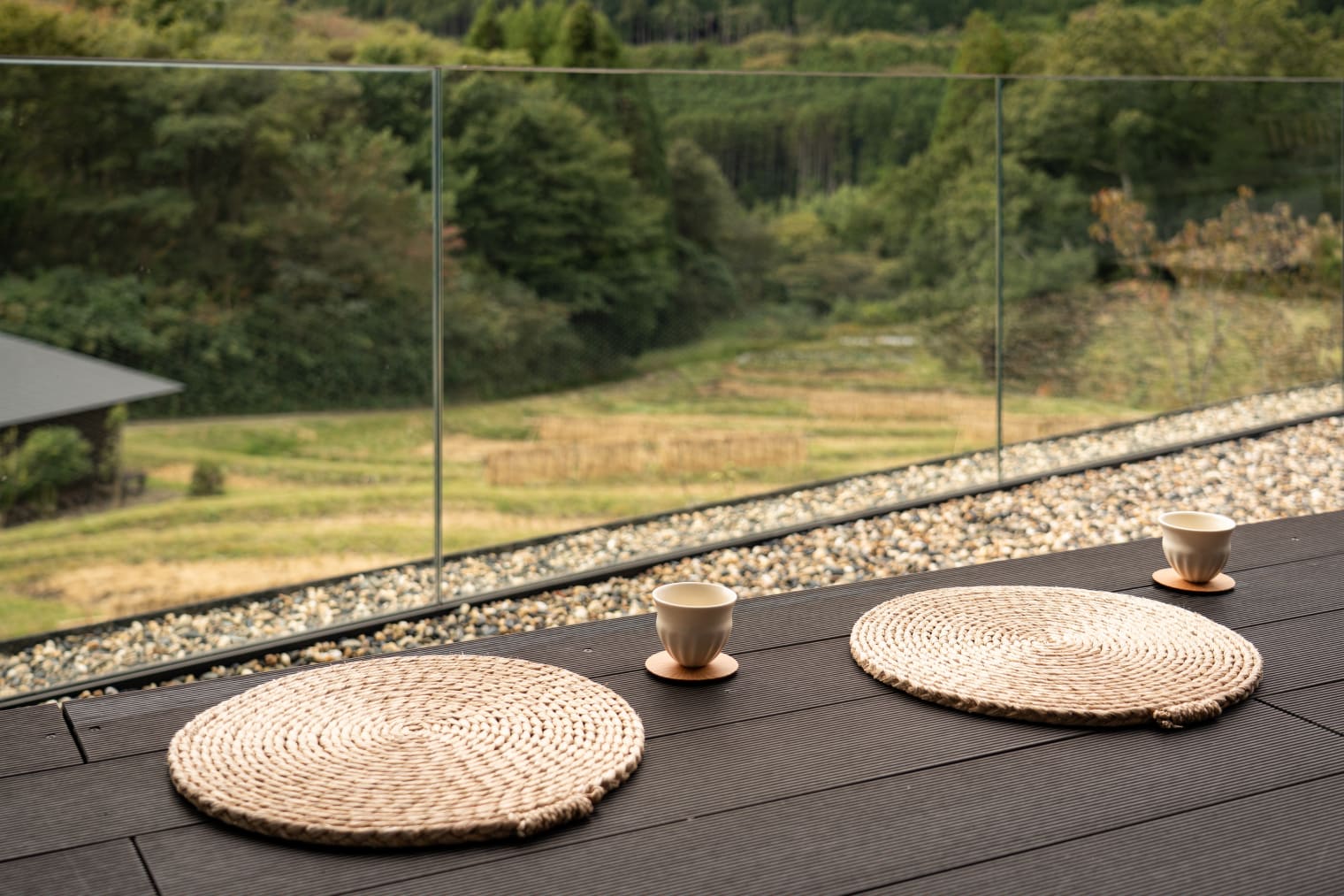 工房での体験後は自身でつくったオリジナルバックを持って界 由布院へ。客室の照明や食事処、パブリックスペースなど至る所に、七島藺が使われており、そのぬくもりを身近に感じることができます。本プラン限定で七島藺で編まれた丸ござも用意します。滞在中は、バックを持って館内を散策したり、棚田を一望できる棚田テラスに丸ござを敷き、のんびりとした時間をお過ごしください。
