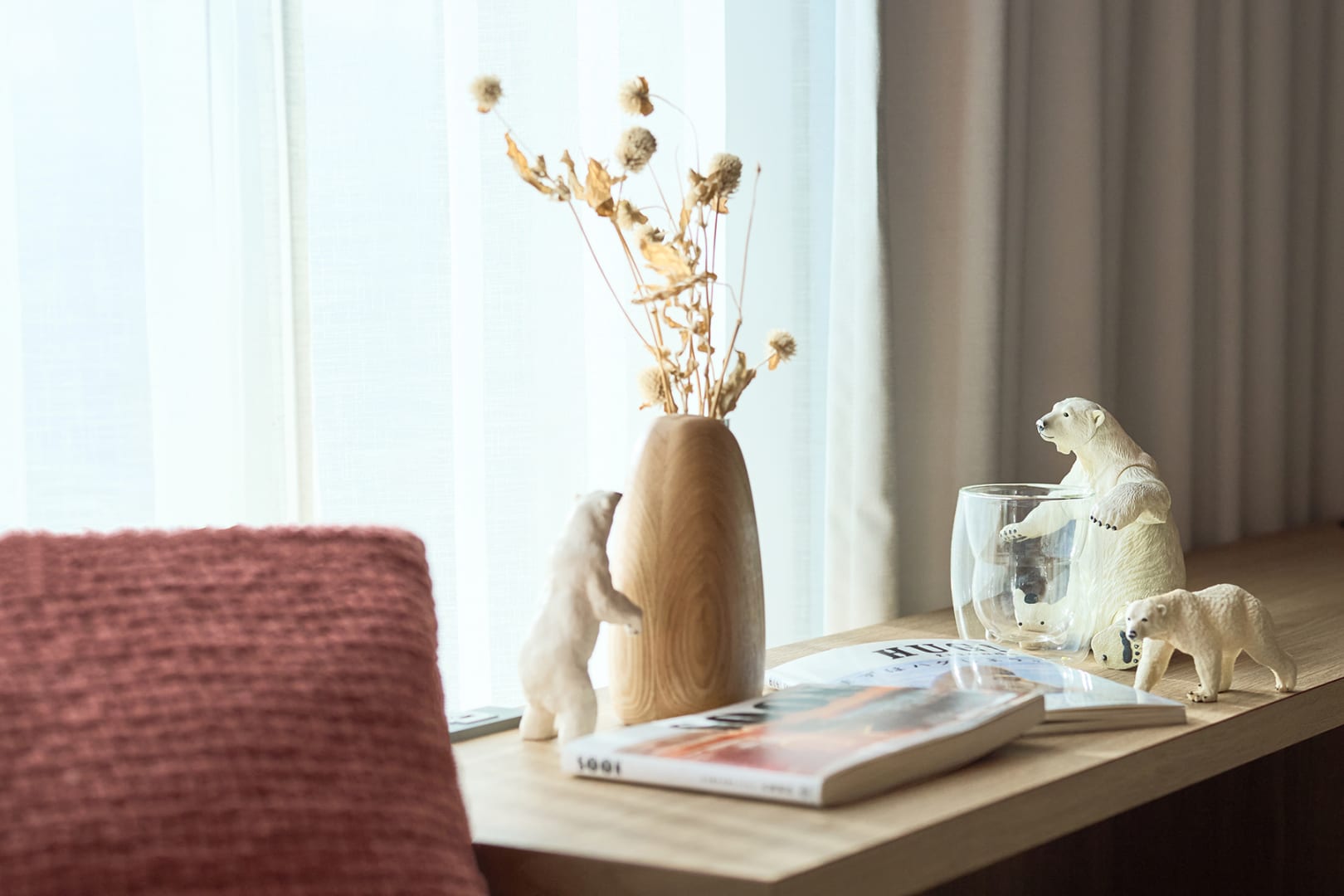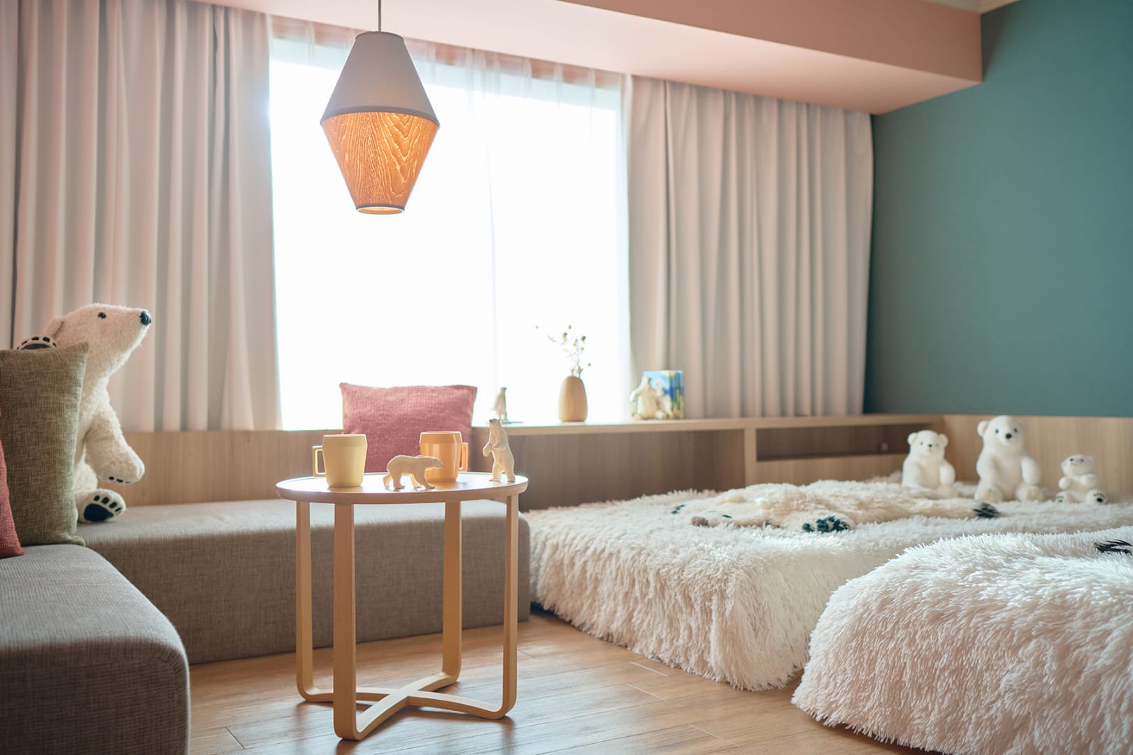 旭山動物園の人気者、シロクマをテーマにした客室。隅々まで可愛いシロクマがいっぱい。ベッドの下には収納スペースがあり、滞在中もお部屋を広々使えます。