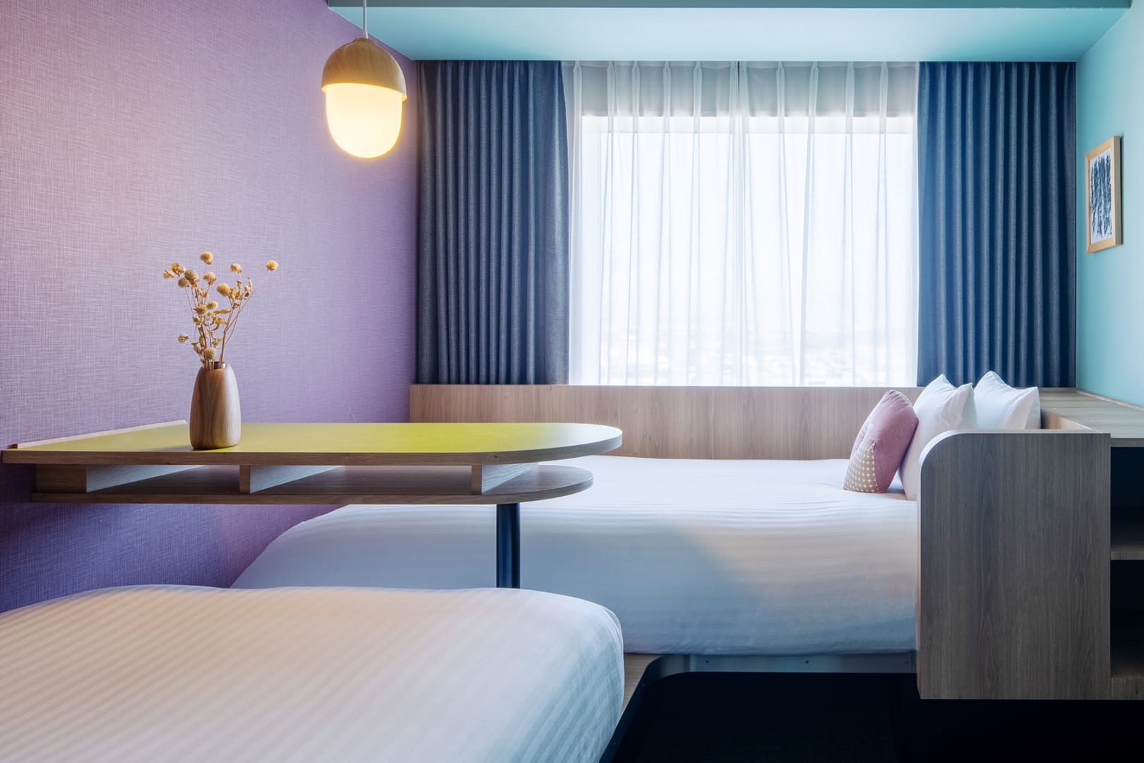 べッドをL字型に配置した、コンパクトながらも嬉しい機能満載の客室。荷物をベッドの下に収納して、ランプ下のテーブルはおしゃべりタイムにも最適。